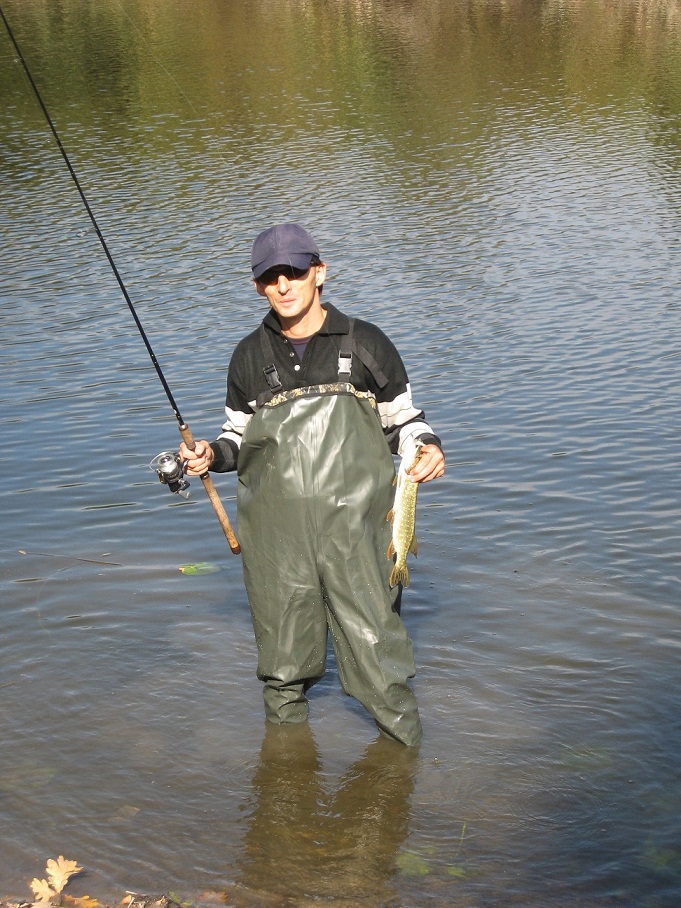 Добрий вечір всім рибалкам, пропоную коротенький звіт про сьогоднішню розвідку на р.Стир. Десь під обід стало зрозуміло, що погода для хижака сьогодні буде сприятливою, і я вирішив трохи вкоротити робочий день і вирушити пополоскати ґуму, ставку захотілось зробити на важкий джиг, тому і арсенал розпочинався від 12(дуже рідко)-і-до 20грам.( Подумав допомогти екологам і розчистити дно річки від усілякого непотрібу, ознайомитись з рельєфом, але в результаті тільки залишив багатенько свого:gi-gi:). Настрій був чудовий, незважаючи на рядові втрати, хоча ні покльовок, ні виходів не спостерігалось, тільки на одному невеликому заглибленні заробив " тичок", від якого залишились дві невеликі дірочки біля самої джиг-головки, можливо судачок, сперечатись не буду. Все йшло по негативній накатаній, і ніякі зміни до позитиву не призводили, і от на одній ділянці вирішив поставити бляху, тіпа "кастмастер"быгы.Закинув під протилежний берег, і за метер проводки( саме на межі сонячного світла і тіней від дерев) відчув, і хоч було далеченько, навіть ПОБАЧИВ покльовку цієї риби:wo_kakaya: : боротьба, еротика, секас і нарешті перекур на березі, жерешок палити відмовився, а я всмалив три, ну й добре;) ( Заважив він без малого 2кг,і правильно, що не зловжив тютюном,бо і я в такі роки ще також за здоров'ям слідкував).Всім НХНЛ !!!