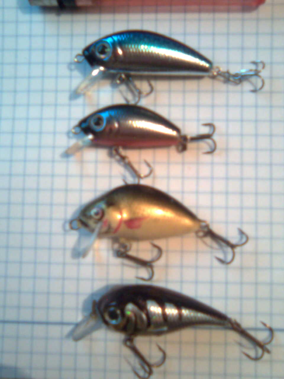 Фото 3 - "Ночные китайцы"... ))) Некрупный судак. Все плавающие, верхние два - с погремушками. Первый погружение - 2.5 метров, второй - 1.5 - 2 метра... Нижний - без всяких наворотов. Изначально ни в какую не хотел работать! Пришлось наклеить на лопасть кусочек пластика с его же коробочки, сделав её (лопасть) чуть шире... Ничё так, приповерхностный... За качество фоток - извиняюсь... Мобила... ((