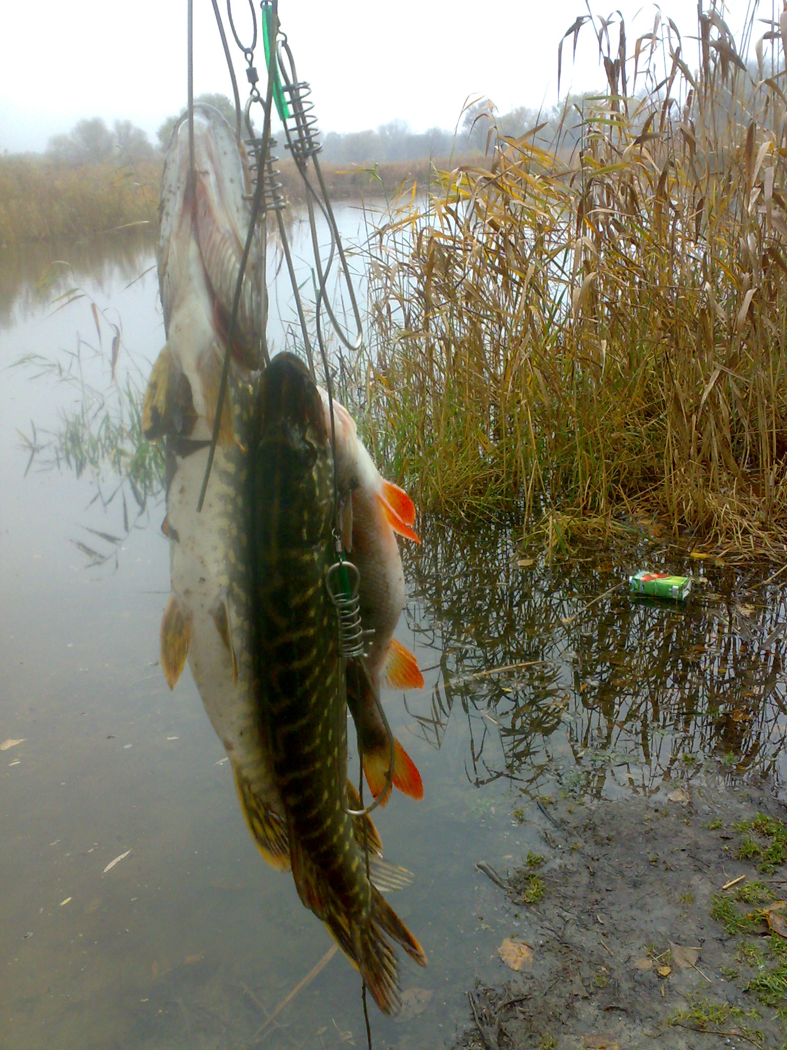 Всем привет.Вчера рыбачел на Псле в районе с.Крамаренки.Выехали с товарищем поохотиться на щучку и окунька.Товарищ на спин со всемивозможными приманками,а я решил применить зимнею удочку и "ЯЙЦА"как потом оказалось очень эфективно.Поплыли на знакомую мне ямку,по пути товарищ розмачивал свои приманки но без результатно.На мелководье даже малька не видно,наверное рыба уже готовится к зиме.Стали на яме,товарищ бросал на меляк и делал проводку в яму,а я с под лодки,как раз обратка крутила именно по яме и почти с ходу три щучки.Одна 1.5кг.и две гр.на 800 и два обрыва лески с хорошей рыбой.Потом брали одни окуня 150-200гр.Товарищ так и не разловился,предлагал перейти ему на мою снасть но не захотел,он испытывал свои приманки.Кстате по его прозьбе сделал ему отбойник просмотрев предварительно материалы и сделав на свое усмотрение,получился 100%-ый рабочий вариант. Отбивал блесна и воблеры с первого удавра,благодоря ему не было потерено ниодной приманки,так как ямка была закоряженая.Под вечер сплавали еще в залив,я половил немного на летнию удочку красноперку,а товарищ дальше упорствовал на спин но так ничего и не получилось.На фото снасти и половина улова,второй половиной чесно поделился с товарищем.Интересная рыбалка получилась!!!