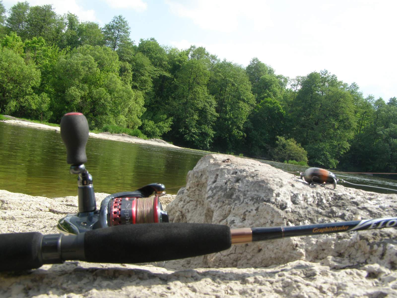 Эта поездка планировалась уже с месяц, то холодно, то дожди, но в этот раз пересмотрев все синоптики все таки решили ехать. И вот в 22,22 я стартую на Винницу, с Винницы 5,40 на Немиров и с Немирова в 13,00(нужно было наконец то поменять морду в паспорте, я и так просрочил 3 года) меня уже подбирают друзяки и мы выдвигаемся на столь прекрасную реку Ю.Буг. И вот мы на месте, все везде зеленое, перекаты шумят, птицы поют, что еще нужно для счастья?. Я как самый не теплячий первым собрал спиннинг и побежал на проверку. Сделавши парочку забросов, получил один сход небольшого голавлика и решил вернуться к остальным, чтоб уже вместе выдвинуться на обследования. Обследования территории проходили два дня, места очень красивые и завораживающие. голавль был, но я бы не сказал, что клев был активным. Как потом выяснилось он еще нерестится вместе с карасем. В вечерних сумерках соблазнил судачка, а с рассветом получил бонус в виде марены, правда она забагрилась. Под конец отдыха Серега обловил привезенный мною ему новый спиннинг St.Croix Legend Elite LES70MF2 и подогнаную мышку от винницкого умельца.