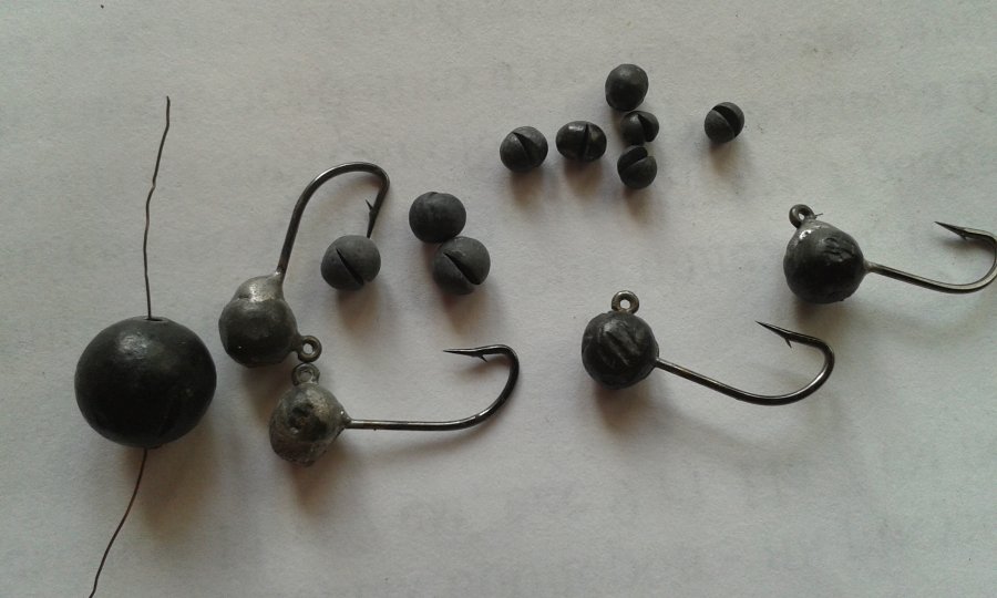 Первый вариант самый простой. В надрезанную дробь, вставляете согнутый на зажигалке крючок и запаиваете. Получаем мини джиг головки. Дробь можно с охотничих патронов, нужного веса. Второй вариант. В дереве делаем ямку, забиваем шарик от подшипника, в ушко крючка вставляем щепку бамбука, стеклопластика, карбона. Заливаем паяльником припой. Третий одеваем дробинку на леску в притык к крючку, тройничку. Это все на коленках. Для эстетики надо сделать формы для отливок и серьезный подход.
