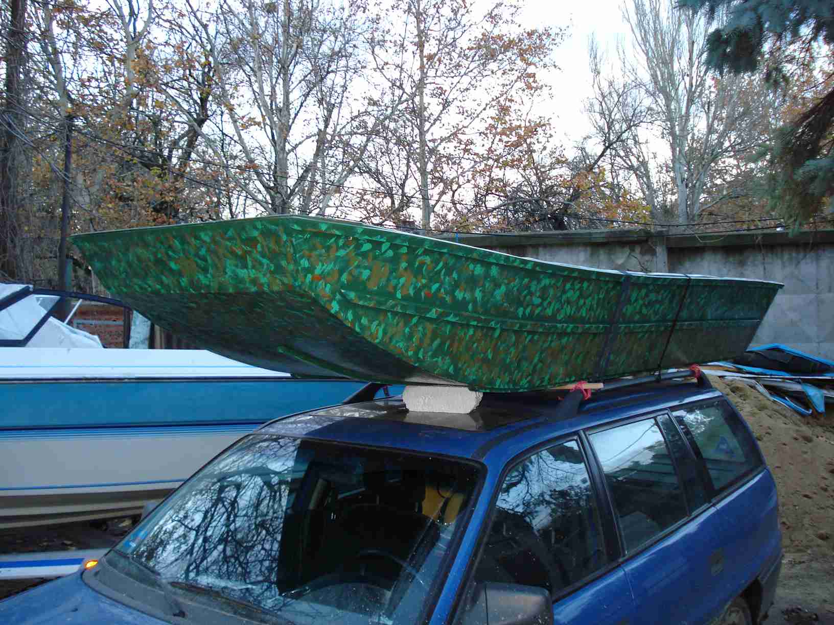 Лодка на багажнике лежит носом вперед и днищем верх. Набегающий поток её прижимает