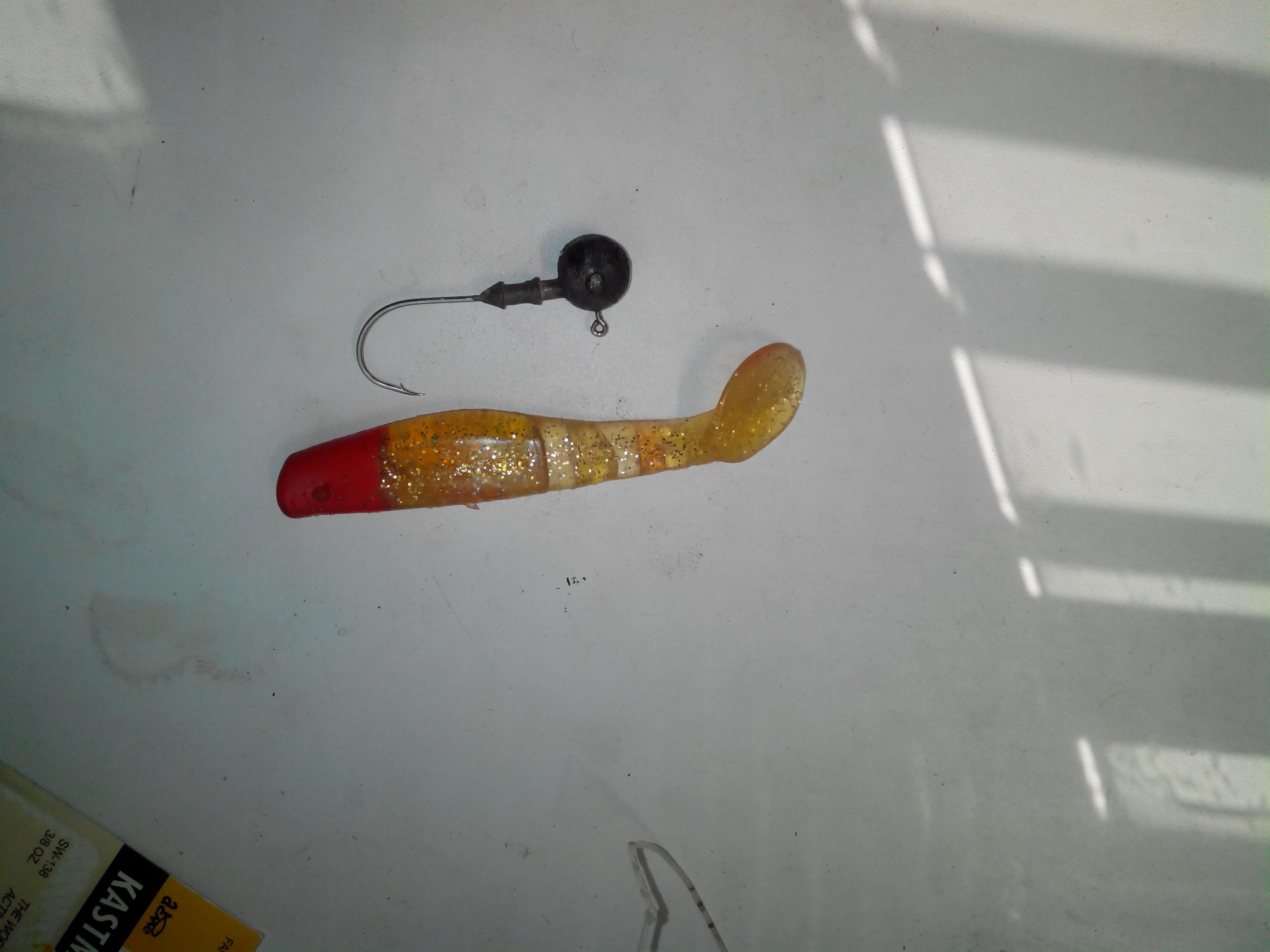 немного борьбы, подтянул рыбу к лодке, взял за карабин на поводке, затянул рыбу в лодку и в этот момент разогнулся крючек на джиг головке)