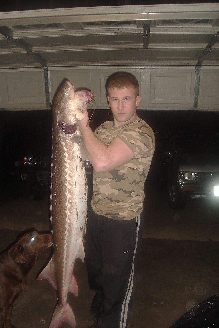 Здравствуйте, хочу поделиться фотографией которую выслал мой друг из Штатов, проживающий в Сакраменто. Ездил он недавно на рыбалку в городок Риовиста, там протекает неподалеку речка Сакраменто и как говорится вернулся с трофеем. Для меня этот трофей вызвал настоящий шок... Осетр был пойман на креветку, причем живую, попросту говоря он с помощью резинки прикрепляет живую криветку к крючку, используя сомовые крючки. Использует при этом метод фидерной ловли, блин )))!!!