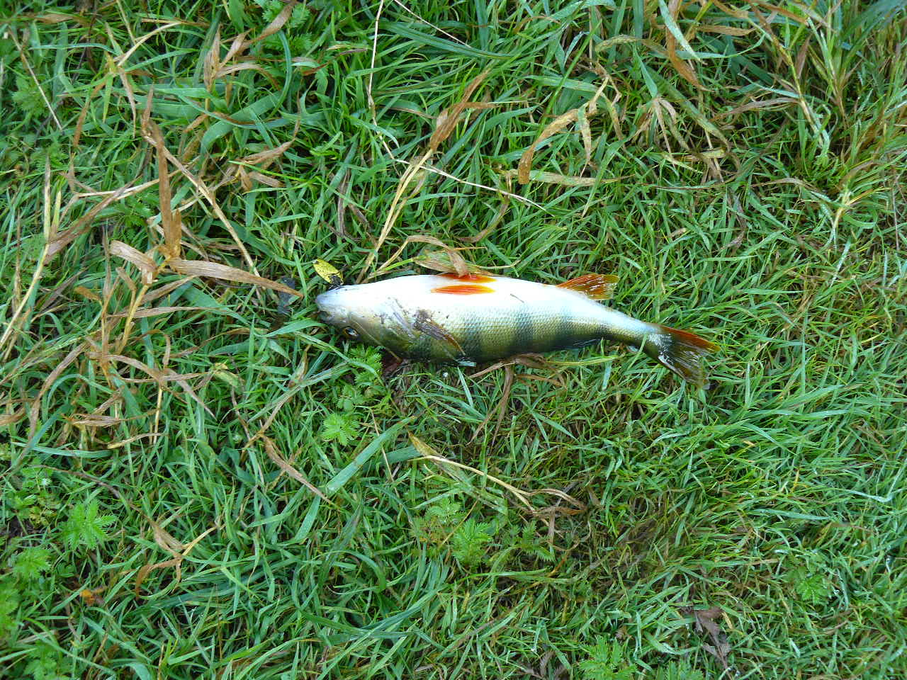 Вже на другий день, а саме ранок – маю знову два клювання, однак на цей раз клював окунь. При цьому приманкою слугувала мікроколебалочка від Івановича (так називаю колебалочку на честь шановного майстра). Як і відзначав, зарослість річки не дозволяє використовувати увесь асортимент приманок. Тому цього разу проводив приманку майже на поверхні води (20-40 см від поверхні води). Результат лову – один окунь та ще один окунь, застрягши у траві, сходить. Узятий окунь позує на фото разом із приманкою, яку вже наступного дня втрачаю.