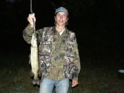 Результат рибалки не забарився вже у перший вечір 24.08.09. На одному із перспективних місць отримую довгоочікувану легку покльовку – це була щука. Полюючи на окуня, натрапив саме на щуку, і як результат поводок із моножилки у 0,16 мм був відкушений. Не довго думаючи, ставлю металічний поводок прямо до поводка моножилки 0,16 мм і вже за кілька хвилин маю друге більш виражене клювання – на цей раз знову була щука. Дещо провозився, поки гасив її ривки та виводив з-під трави, але таки дістав – на фото разом із нею. Тобто, перший вечір рибалки приніс лише два клювання, які було досягнуто за допомогою дюймового твістерка (колір – фіолет) на джигі у 3 грами.