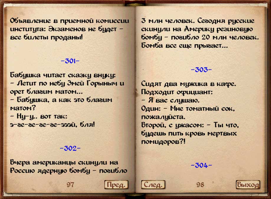 Вам батон нарезной? - Нет, гладкоствольный! *** Парень мой - юморист, блин... Утро. Просыпаюсь от того, что он меня нежно-нежно целует в губы, в щеки, в лобик. Нежусь.... И вдруг, его разочарованный голос: "А почему ты не превращаешься в прекрасную принцессу?.." *** Смотрю на коллегу - стоит, наливает чай, кружку под наклоном держит, наверно, чтоб не пенилось... Хорошо человек отдохнул. *** - У нее в глазах какая-то искорка есть - По-моему, ее тараканы в голове какой-то праздник справляют и это салют.. *** Табличка на пляже в Египте: "Рыб запрещено кормить, так как они утрачивают навык охоты и начинают жить попрошайничеством". От руки приписано: "как настоящие арабы". *** Подарили модельку самолетика. Читаю - "not for children under 14". Потом руский перевод - "для детей старше трех лет". Суровые русские дети... *** Замечательное наблюдение продавца, сделанное 1-го января: - Утром в магазине вообще никого нет... потом начинают тянуться дети с записками. *** Даже в больнице сомалийские пираты стараются захватить чужое судно.