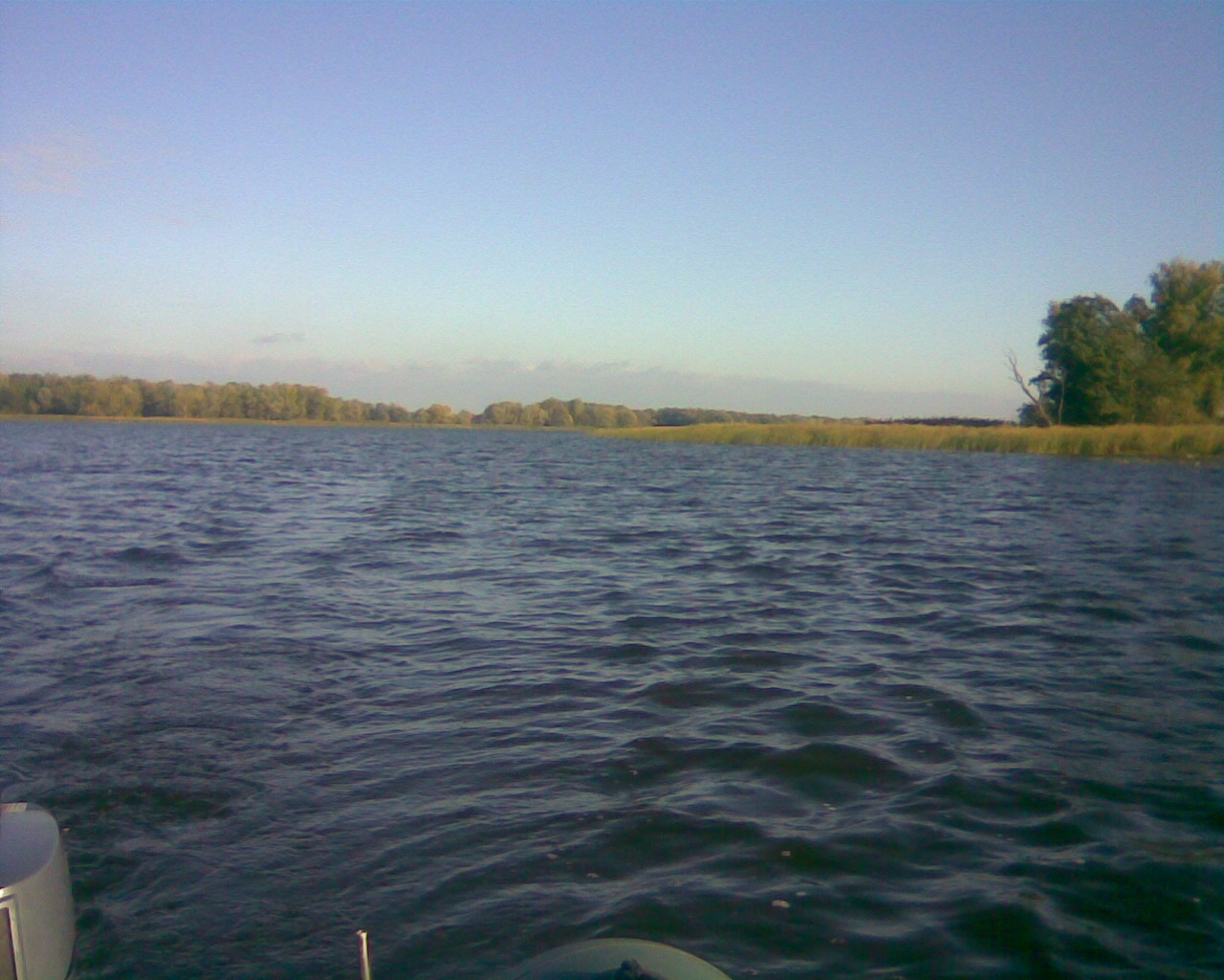 Утренний клев мы так и не увидели, то ли прозевали, то ли его и не было. Было немного не по себе, поскольку виденные нами экипажи несколько раз вынимали из воды щуку, хоть и не всегда товарного размера, мы же ходили без поклевок. Проскочило, правда, пару окуней, но мы-то хотели щуку. Имеющийся арсенал воблеров скучать не позволял - искупались даже те воблера, которые несколько лет воды не видели. Попытки поискать щуку по другим местам привели к мелкой травянке у Олега, которую он отпустил, не поднимая в лодку. Но Олега не так легко сбить с толку, и мы вернулись на свое проверенное место.