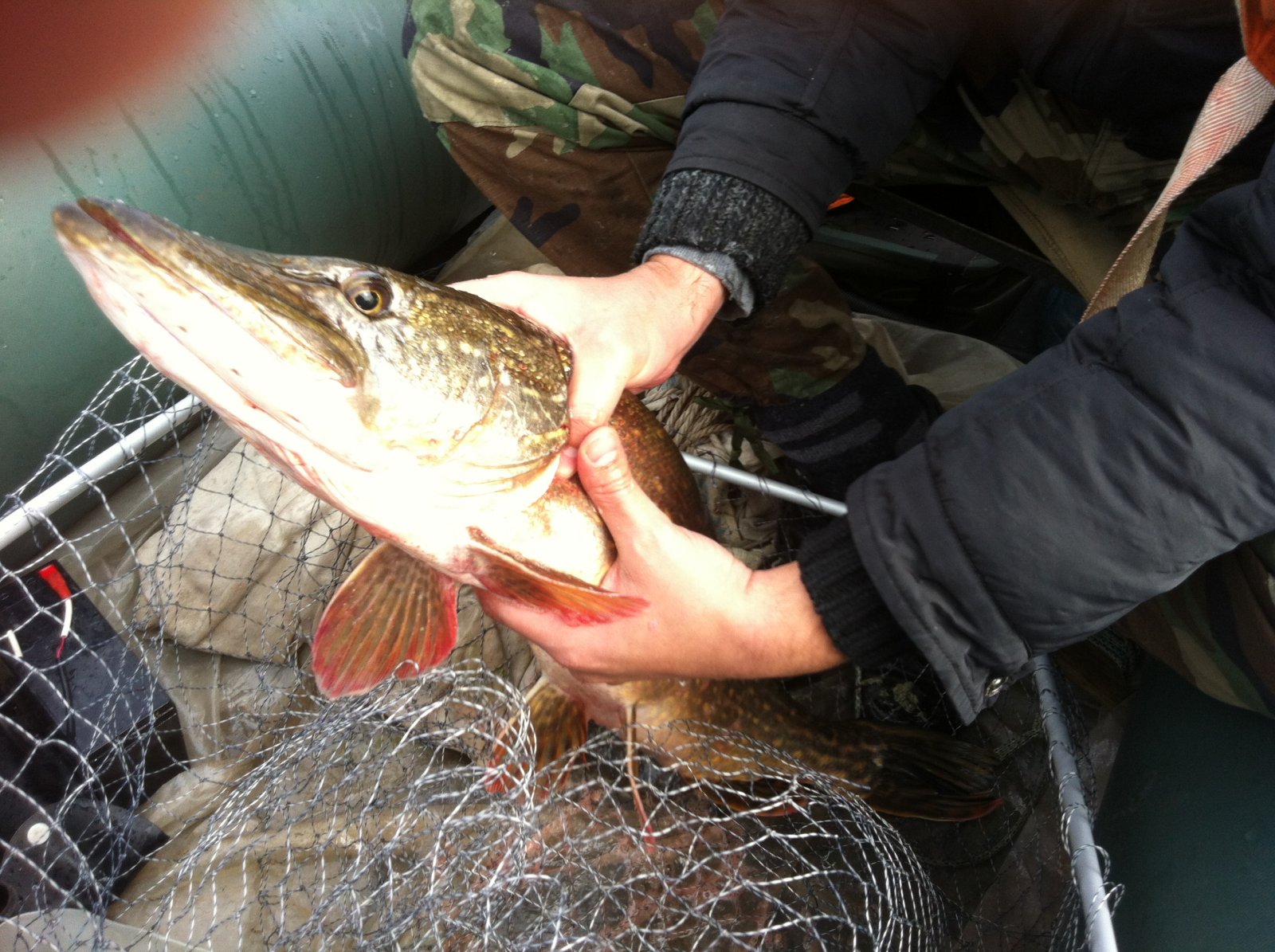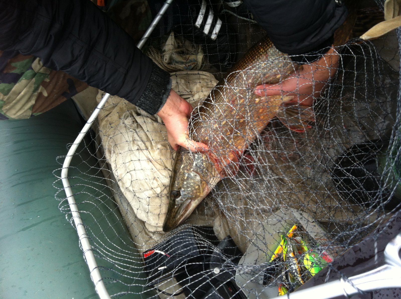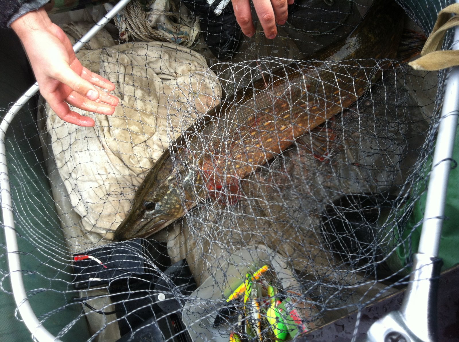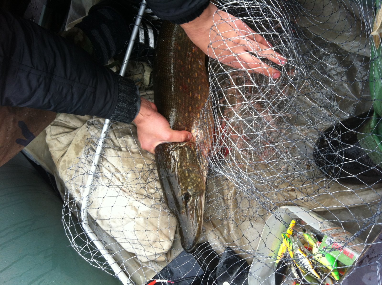 Погода стала портиться, начался довольно-таки сильный ветер, толкнули воду, и на воде стало очень неуютно, да и усталость начинала брать своё. Где-то в половине третьего удача улыбнулась и мне, и я вытащил щуку - сестру (по размерам) щуки Олега. Долго мы ее из подсаки выпутывали, дала она нам жару. Дальнейшая рыбалка удачи нам не принесла, и около 5 вечера мы уже были на берегу. Пожалели, что соревнования были в субботу, а не воскресенье - воскресный улов у нас получше намного оказался :D. Тем не менее, медали подтвердили, удовольствие от борьбы с трофеями получили.