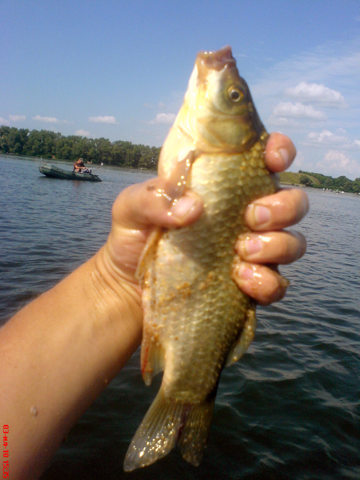 Ну а теперь об интересном за сегодняшний день.Вечером узнав о том что выходной впереди,не задумываясь начал готовиться на рыбалку.Взяв у соседа красных и сделав корм горох+фишка-лещ и мастырку в 5 утра отчаливаю от причала.Не жарко,ветра не было но вода стояла полностью,даже шла обратка.Имерив дно,хоть и дедовсим способом нашел глубину 7 метров,хотя товарищи советовали 9.Ну да ладно,не нашел так не нашел,до половины 7 ничего!!!Потом потиху расклевалось,пошла водичка,тоесть появилось течение и дело наладилось.Ловились подлещики и как можно уже говорить,по теперешнему времени-лещики.Вес в пределах от 300 до 1100гр.Приятно конечно тащить против течения того,кто потяжелее.И тут очень сильный удар...Тащу,в предкушении чегото интересного-судачек на 1100!!!Оч. приятно.Вообщем лещецы красивые-3 шт.,подлещики поменьше-6 шт. и 3 карася.Обьявили о вертолетном шоу,да и жарковато стало,собрался и в 11.30 уже на берегу наблюдаю вертолеты которые носятся над Днепром...