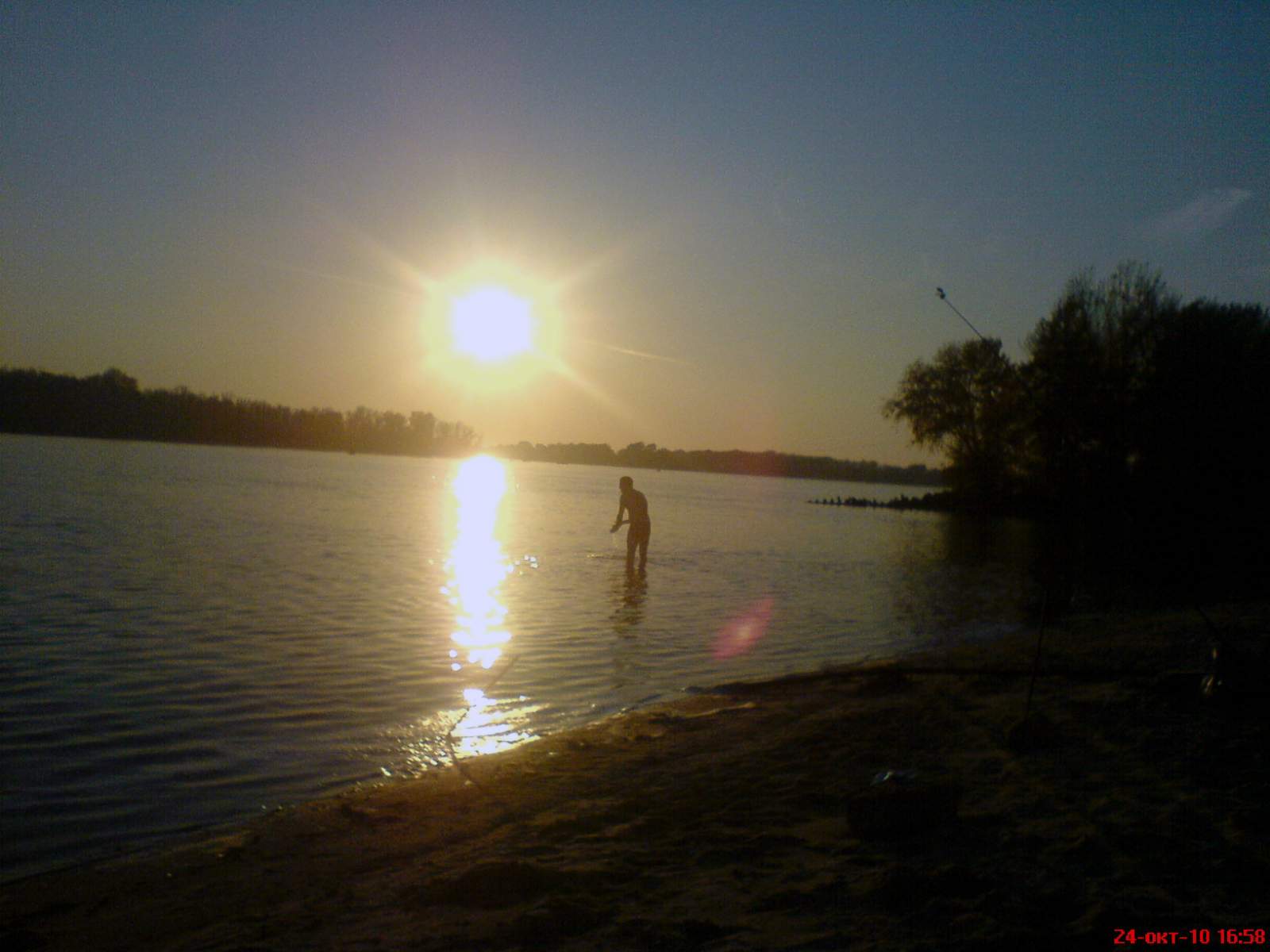 Возле лагеря, еще тоже на воде, встретил Толика, который уже почти в темноте еще джиговал, но безрезультатно. Прибыли на берег и быстренько за дровами. Далее костерок, чистим картофанчик, и делаем его с тушеночкой. Чтоб совсем не замерзнуть, в ход идет очередная с коньячком... Слово за слово, возле костра, под картофанчик с тушенкой, травили байки, разговоры о том о сем...Был очень тихий вечер, нигде ничего даже не шелохнеться, полная луна освещала все вокруг как прожектор с неба, и было светло как днем почти. Изредка то тут то там, слышны били выстрелы, охотники наверно палили в ночную дичь...