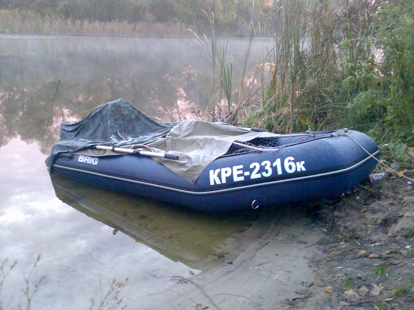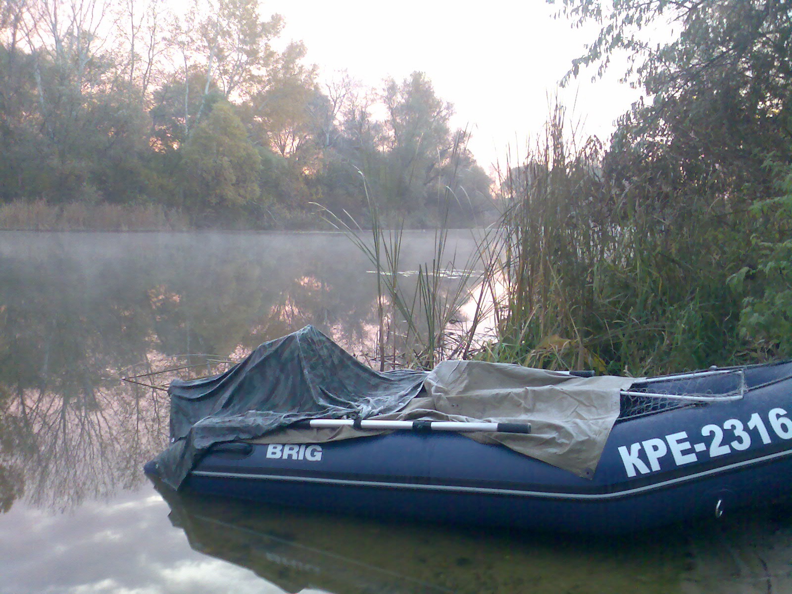 Утром решили встать пораньше еще затемно, так и получилось. С утречка быстренько развели костерок, закипятили воды, кто кофе - кто чай. Баркасы на воду и за зубатой. Выплыли рано, над водой пар стоял, все как в молоке. Ночью наверно был мороз, все вокруг было покрыто инием, и легкой изморозью. Но как нестранно никто не замер, спать было ТЕПЛО.