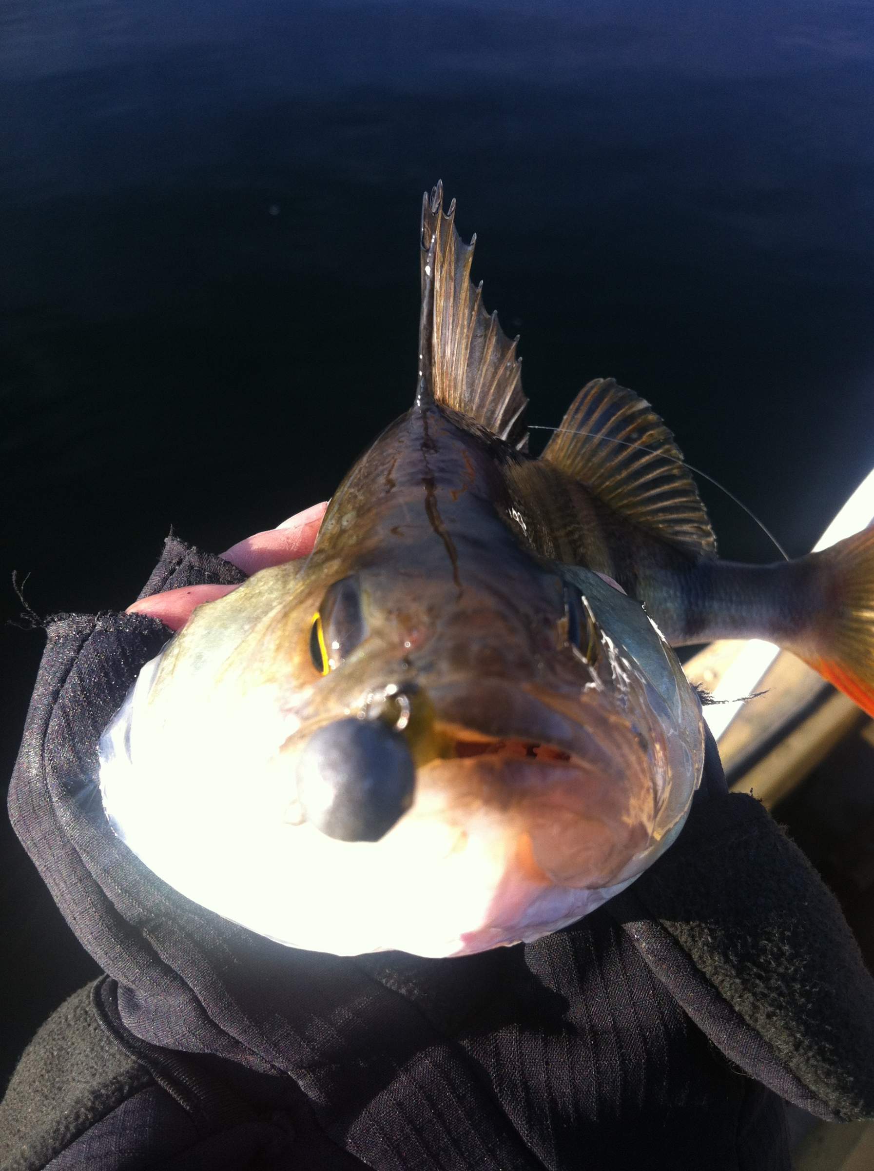 В воскресенье ловили окуня на старых местах. Ветра практически нет, вода 7 градусов и очень прозрачная (3 метра глубины видно каждую ракушечку). Было принято решение не мельчить с приманками и весами (ловля предполагалась на глубинах до 6 метров и хотелось окуней покрупнее), поэтому я ловил на UFM до 9 гр., а брат на Breaden GRF-83 до 10 гр.(буквально недавно приехавший из Японии). Но основные веса были 4-6 гр, правда можно было обойтись и меньшими, но тот-же Вагабонд M.H.C. Worms Air Bait 2.5inch окунь предпочитал жрать только на 5-6 граммах при протаскивании по дну с большими паузами. Течения не было вообще, активность окуня низкая, приходилось искать и уговаривать. Науговаривали за сотню точно, самый большой грамм 600, основной вес 150-350. Мелкого практически не было. Не смотря на пассивность окуня у некоторых выловленных в пасти были маленькие краснопёрки, значит кормиться он всё-таки желал. В связи с тем, что с самого утра заклинила Минн Котта на катере, а мы без запасного якоря, приходилось вязаться концом к камышам, то в принципе результат не плохой. Ведь без якоря правильно стать на точку очень проблематично.