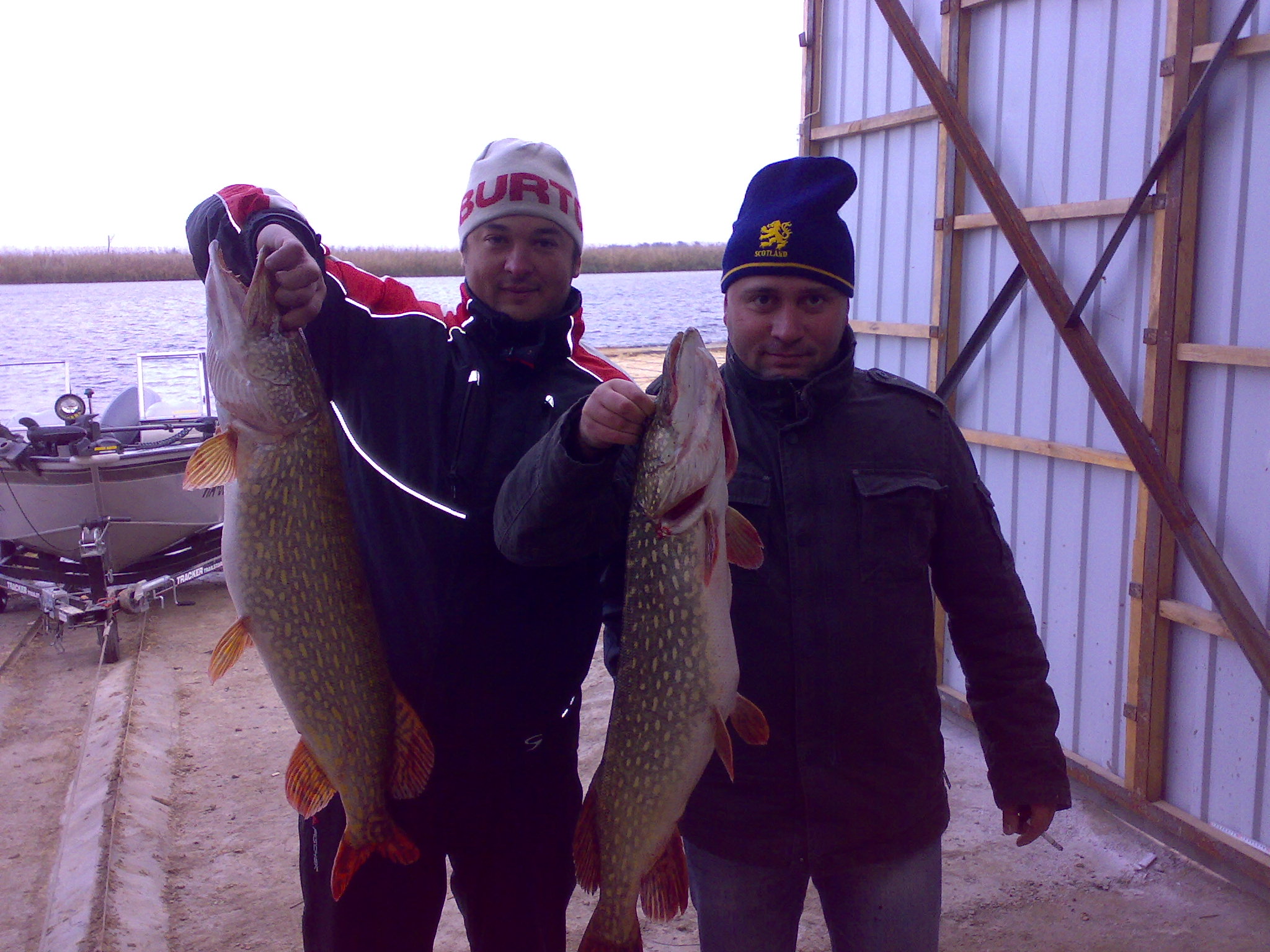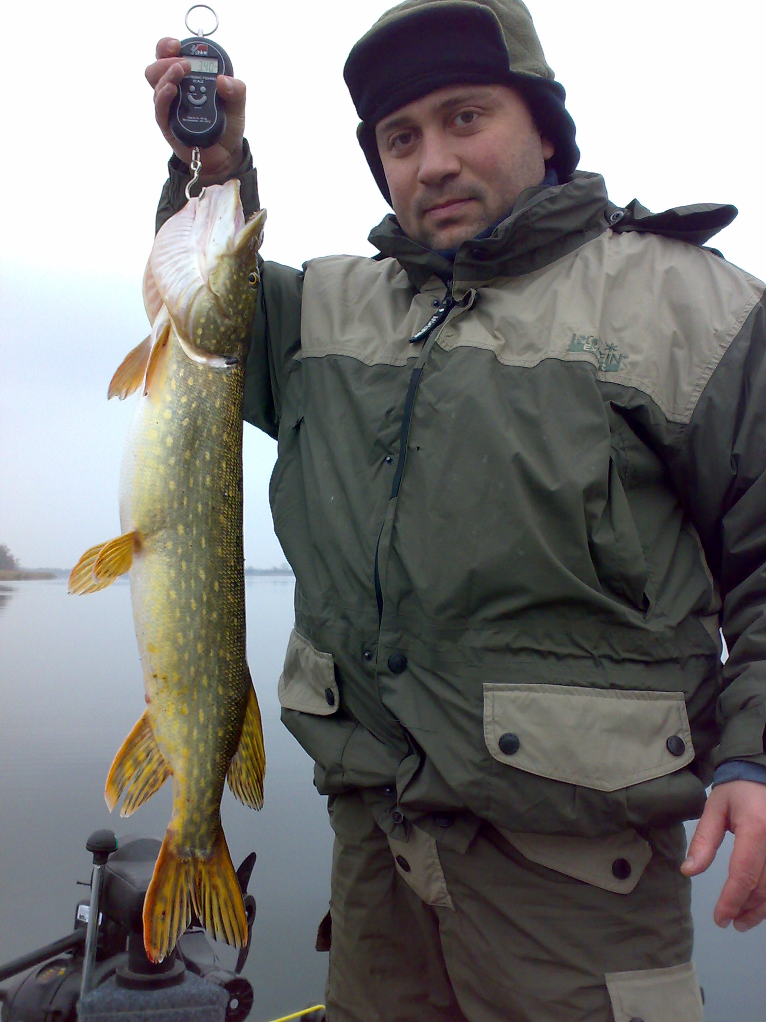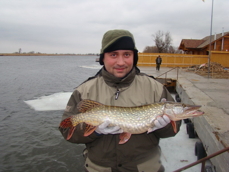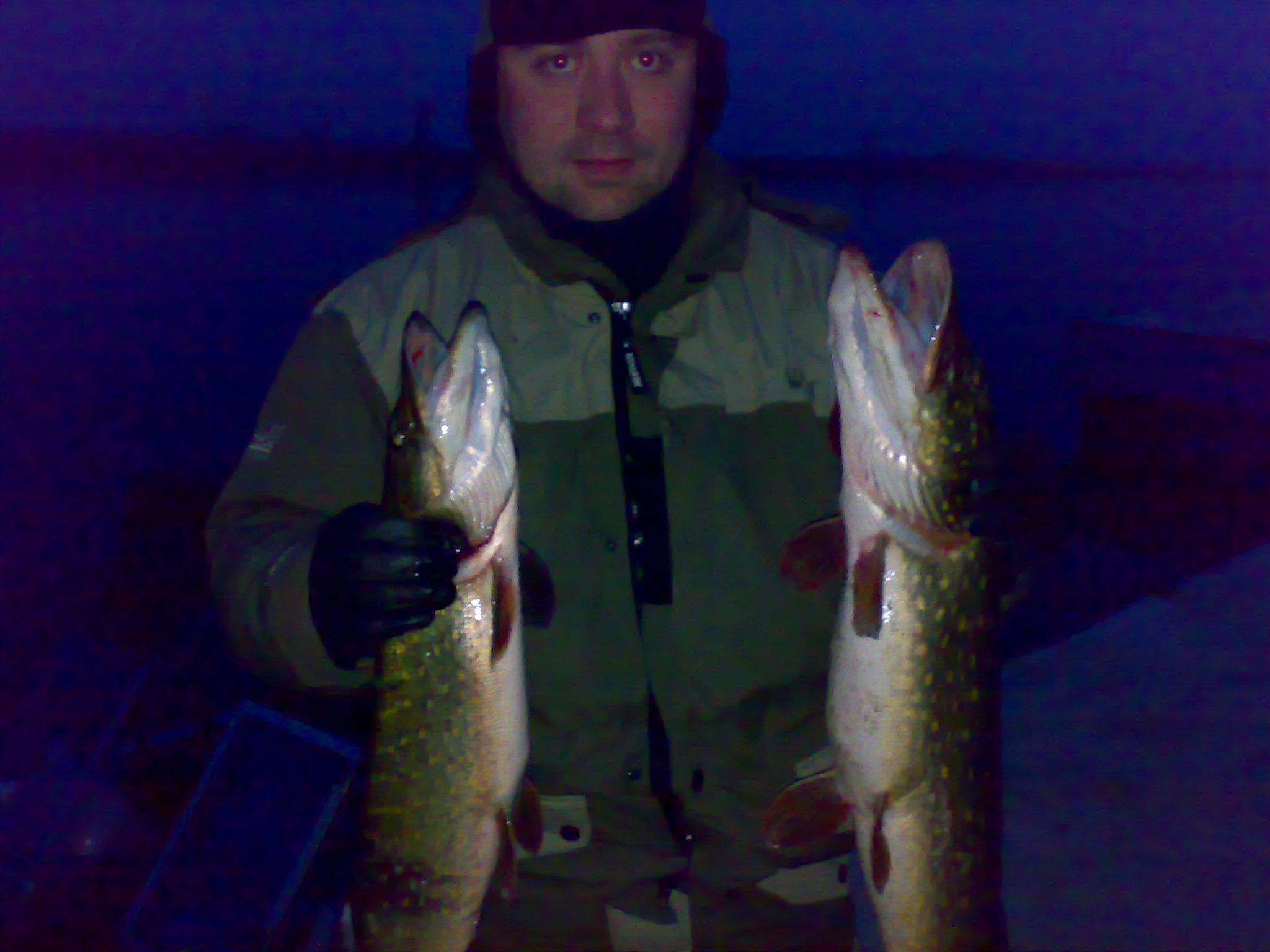 На Днепре стоит лед, а совсем недавно 29.12.07 был последний выезд, тишина , погода -1-3 в. без ветра, комфорт! Только кольца мерзнут, пошли снова в район Кузменков с Олегом. Последний выход, торчим от погоды, но не тычка, проходит минут 30 (где-то район 13.30), чувствую что - то зацепил. Идет с ровными колебаниями по кругу (надежда на утопленный Лумис товарища с моей катушкой шимано 2500, когда я упал в ноябре с катера) или банка что ли, но нет, щупак - красавец, раскрас просто супер! Не понял как взял. Затем у Олега мощная поклевка, борьба, фрикцион и ... очередной обрыв шнура, а так мы надеялись на последний трофей. Я продолжаю джиговать "чемпионом" оранжевый корморан. Хотя и так настороение супер. И тут мощный классический удар со дна, после первой щуки, здесь борьба не на шутку, дергает так что сердце как после ведра адреналина, под лодку фрикцион и ... есть, на вид 2,5 кг, как оказалось после взвешивания на базе 1950 и 3250 (это после ноября- декабря, весной на 1500 пойдет за 2500). И довольные вернулись на базу (а там уже на берегу баня русская парится с вениками). Кстати в Рыболовном мире вышла статья о нашем Кубке закрытия сезона на Дельте Днепра, так что все работает.