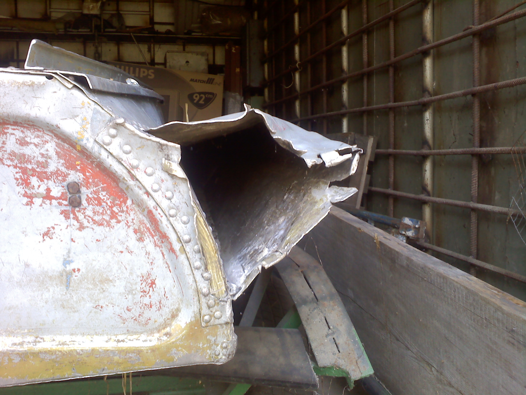 Если левая часть целая то на правую можно поставить латку и стянуть заклепками. Особых проблем в этом не вижу. Если снимать були то придется заделывать по правому и левому борту все дырки от заклепок или резать турбинкой.