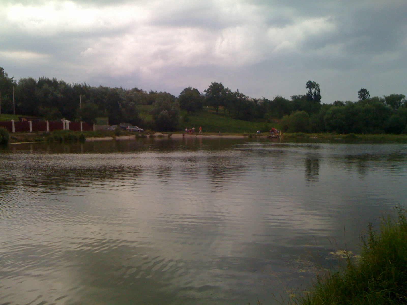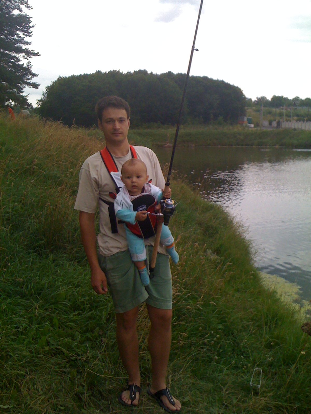 Сьогодні, на День Рибалки, я на жаль не зміг вирватись на повноцінну рибалку. Проте, коли звільнився - о третій дня взяв дружину, малого, запросили родичів із собою, та й зібрались покупатись у с.Вінницькі Хутори, на невеличкому ставочку у дебрях самого села, якби раніше не показали нізащо не знайшов би (не ті що біля траси). Вода чиста як для ставка (у с.Могилівка на карєрі брудніша), людей небагато, вхід/вихід із води нормальний, на беоезі сосновий лісок - лєпота... Ну думаю, як таке діло чому ж не взяти пару спінів. Приїхали о 15-20 закинув 3 шт на макух, ну і там жаримо сосиски, імо, купаємось, і взагалі розважаємось як це прийнято у таких випадках. Поступово небо затягнули хмарки, переходячі у хмари, зявився вітер, почули грім - відповідно почали збиратись - і тут чую внизу (там треба спускатись - метрів зо 10 до води). дзинь-дзилинь - спін аж піскочив, розвернувся, трах бах тарах я туди біжу чуть не падаю, прибіг , а вже все, нікого на гачку нема, ну тіпа підсік, бо ж люди з сторін (і відпочиваючі і рибаки) дивляться на мене, і з діловим виглядом махаючи головою витащив снасть, ну там дійсно нічого нема. Поряд сиділи коллеги по Дню Рибака - у садку десь на 4кг коропчик ( і це на такий маленький ставочок ), ну не думаю що із собою привезли. Рибалка коштує чи то 15грн чи 25грн, я та і не зрозумів, бо до мене ніхто не підходив із білетом, хоча я не проти був би заплатити (давно бачив щоб так підкидало спін). Почався дощик, і о 18-00 я був уже вдома на Славянці. Так що покупатись встигли, і порибалити, а головне зодоволення отримали від усього перерахованого (якби не дощ). Можу розказати схему проїзду - пишіть у лічку. Місце хороше і просто для відпочинку сімєю, пока практично заповідник (якби іще всі із собою мусор забирали... ). Малий просто юний рибак - навіть катушку правильно тримає
