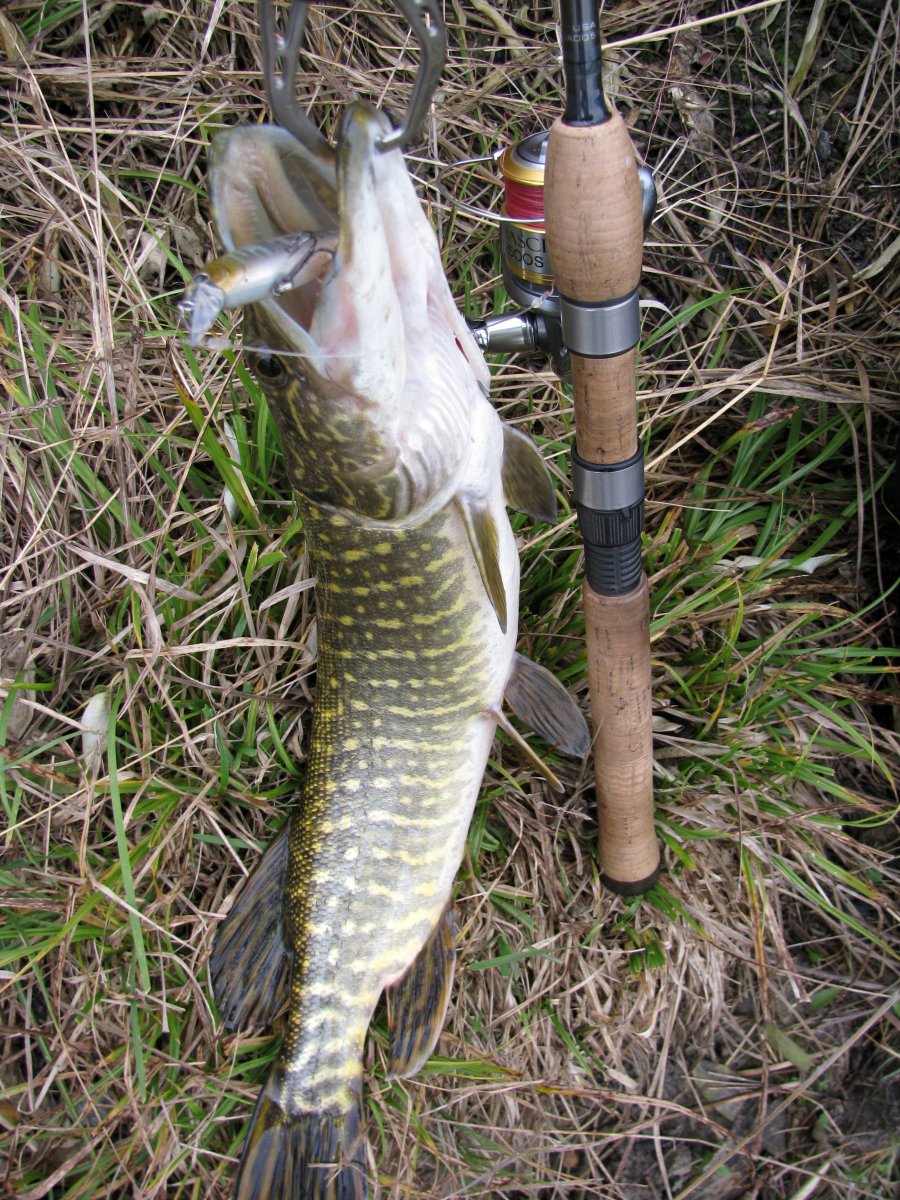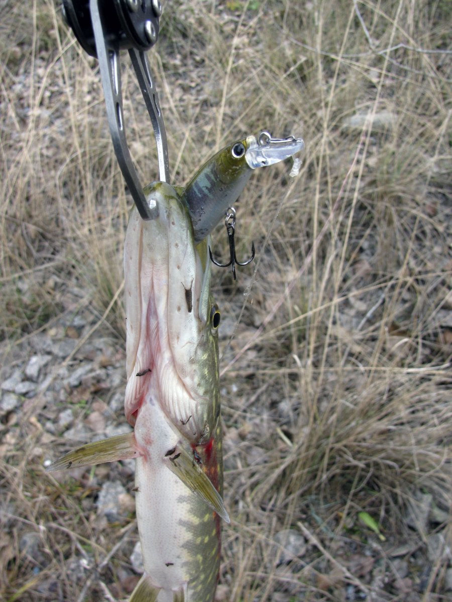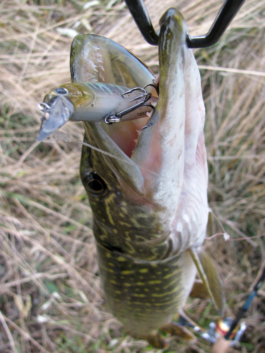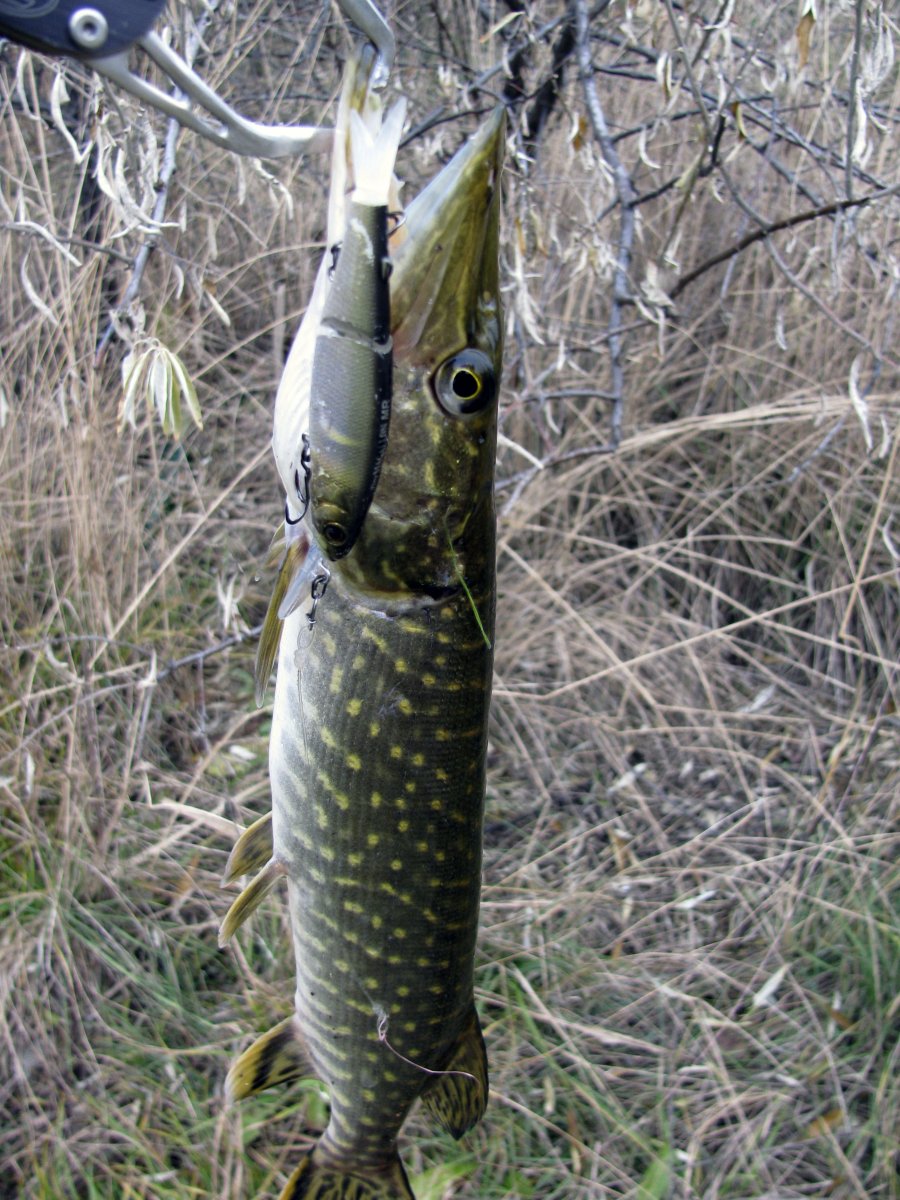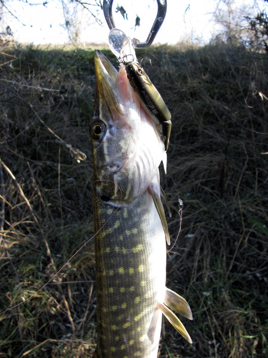 Пополудни удалось посетить этот замечательный водоем. Присутствует небольшое течение, а значит есть надежда на активность хищника. Собираю на берегу комплект для твичинга и в "даль светлую". Щука активна, но довольно привередлива к приманкам. Прогулку можно было назвать рыбалкой одной приманки. Безоговорочным лидером в поимке зубастой оказался Поинтер 65 от Лаки Крафт. На него и были пойманы пол дюжины щупаков. Наибольший на 1.2 кг. При смене приманки следуют легкие тычки, но подсечь клеваку не получается. Перепробовав с пяток воблеров альтернативы лидеру не нашел. Так и рыбачил в течение дня с этой приманкой.