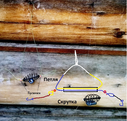 Ловлю на обычные кормушки пружины. Снасть скользящая, т.н. «in-line».Два поводка, выше и ниже кормушки. Нижний лежит на дне, верхний /крючок/, сантиметра 3 над кормушкой. В общем, большой разницы в клеве на верхний/нижний не замечал. Но, бывали такие дни, что брало только на верхний поводок. И то, только днем, и только плотва.