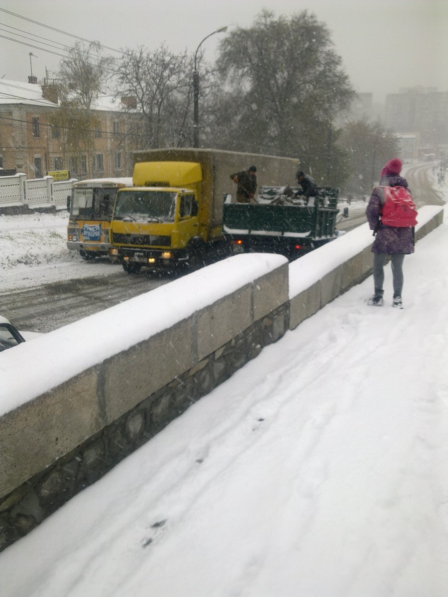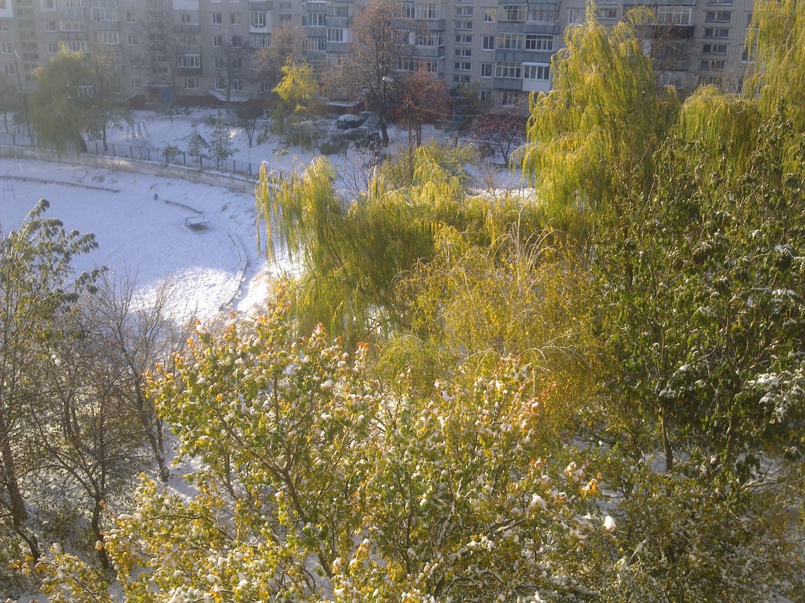 Ось такий вигляд з вікна сьогодні зранку. На відповідь комунальних служб міста чому вони, як завжди, не готові до зими :стыдно:- вона прийшла нежданно негадано:tomat:, таки да, нема чим крити - білий сніг на зеленому листі.