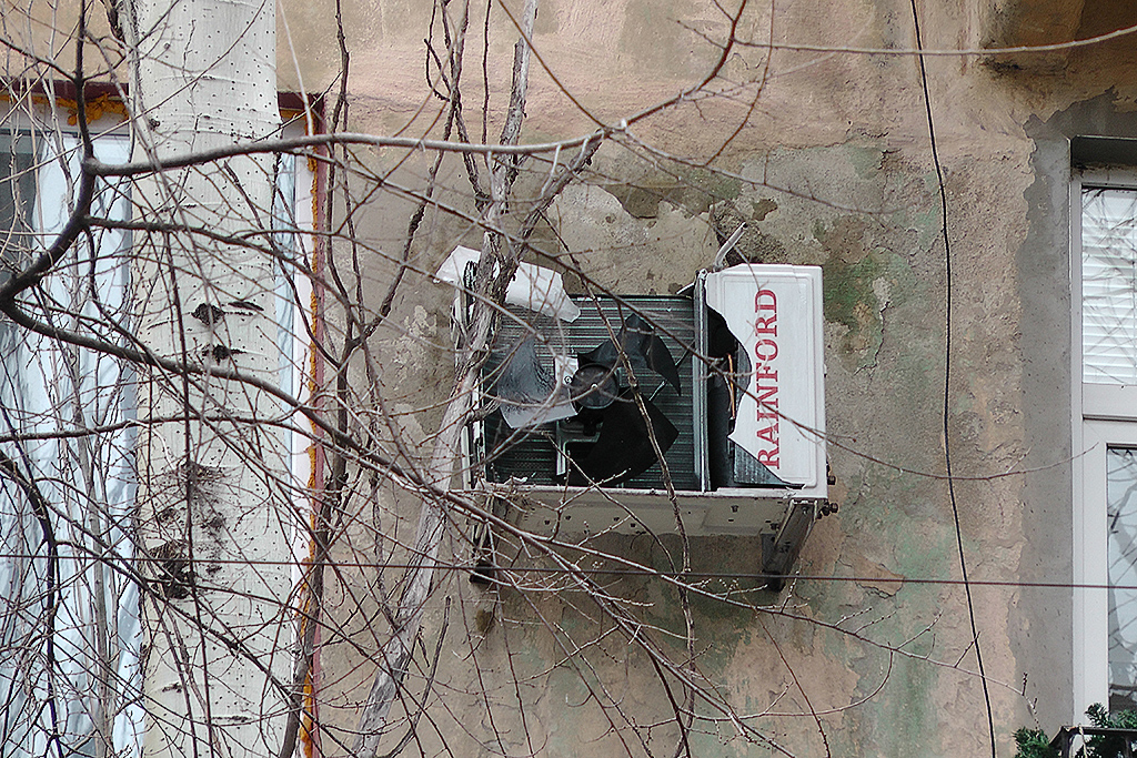 По улице Костенко, рабитые вывески магазинов... даже крышку ролетов на одном оторвало... и сосульки в несколько этажей: