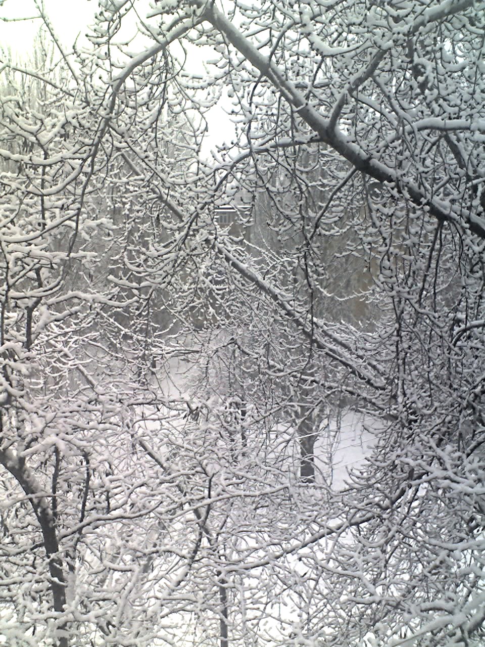 Сегодня утром увидел в окне как прикольно висит снег на ветках: