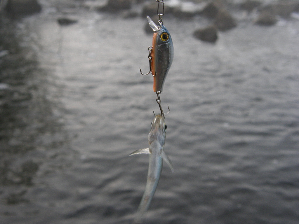 Затем произвожу замены приманок, и вот на "Бэби Кренк" от Цурибито садится нечто, что не голавль не окунь и не щука, это точно!