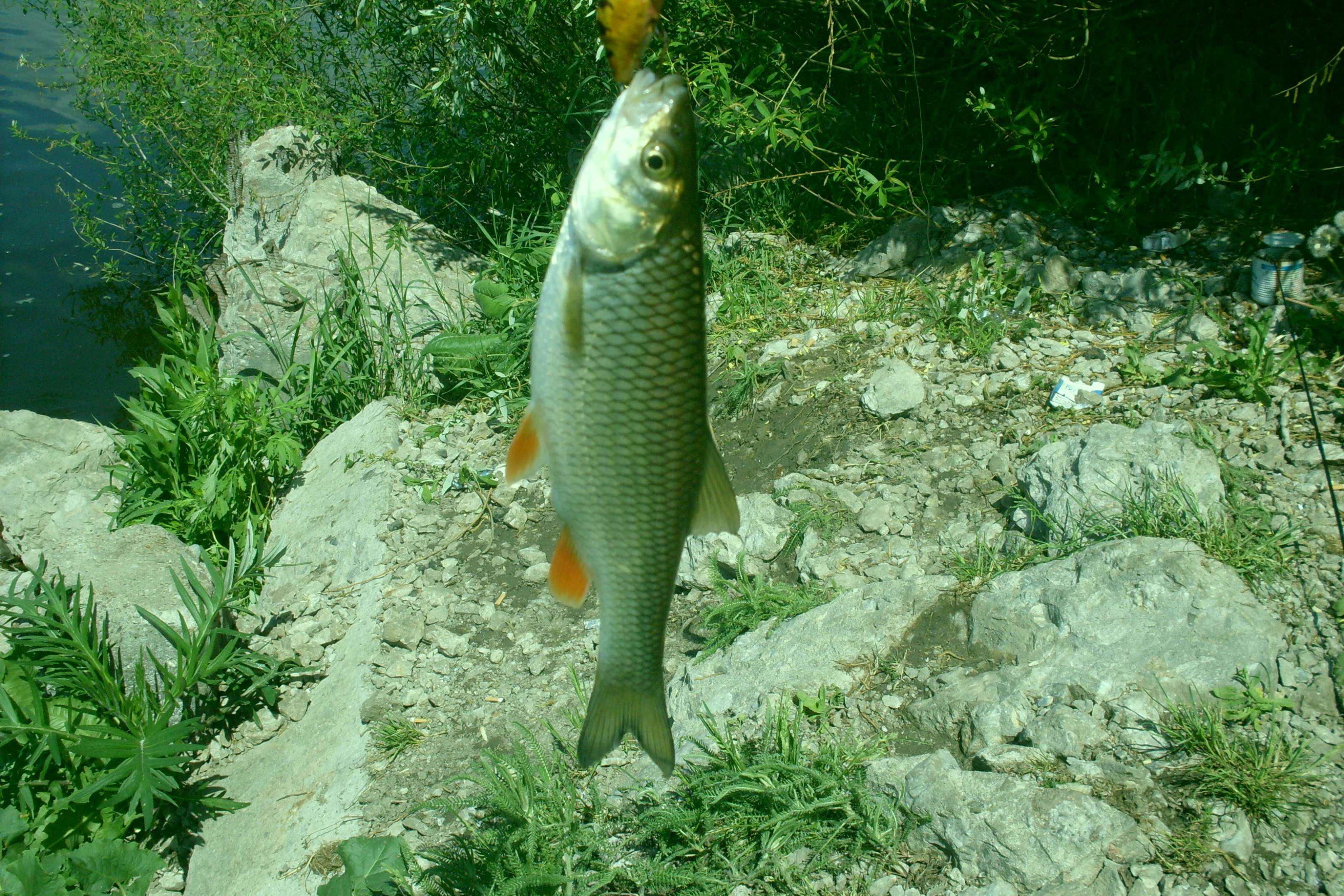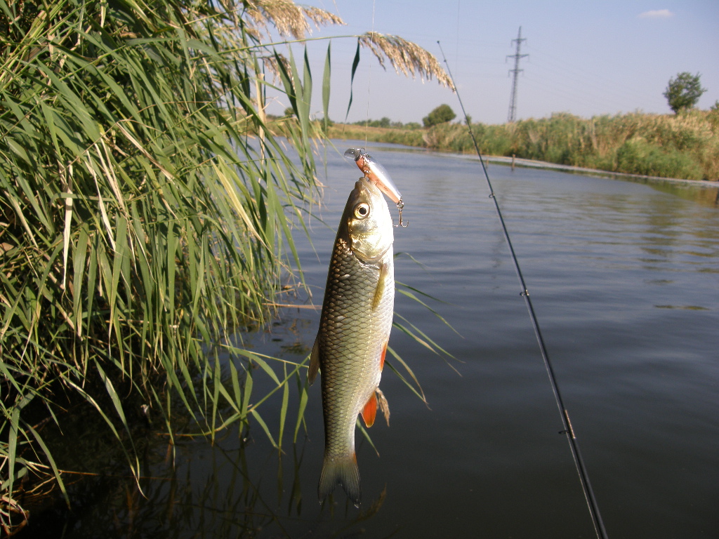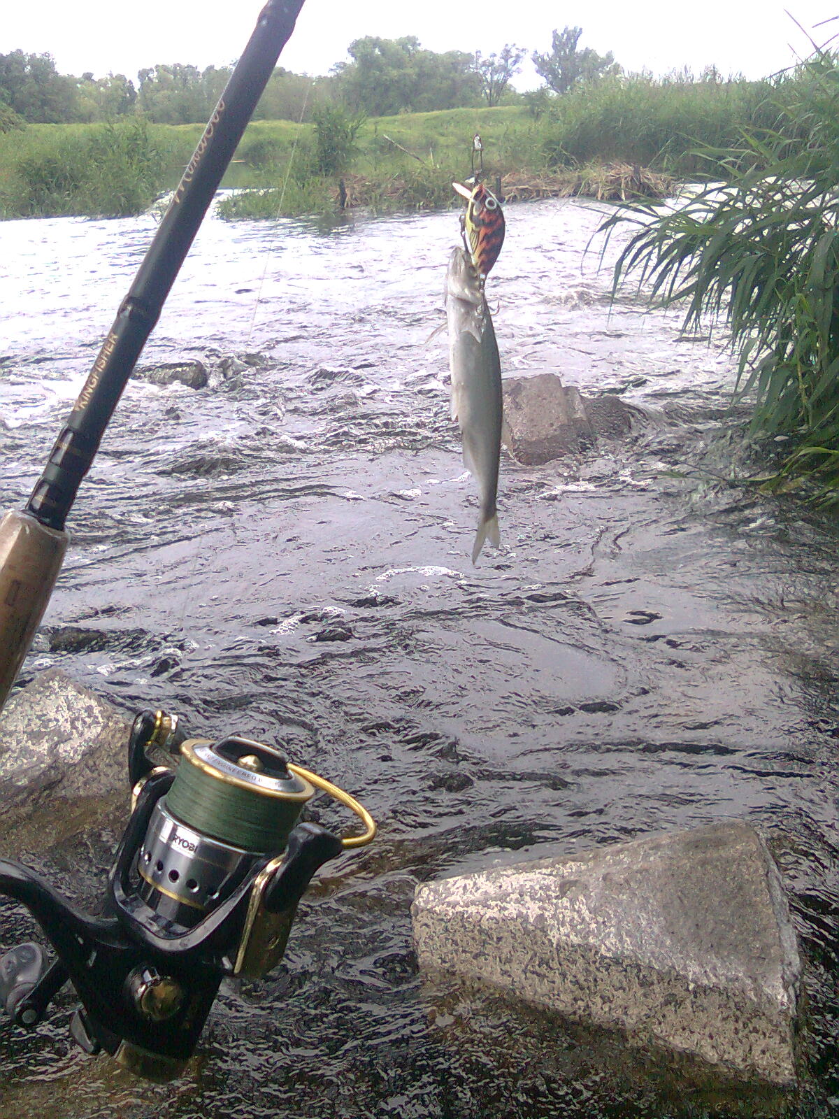 ну а мы со спинингами ничо не поймав, решили вернуться в Васильковку. там разбрелись по берегу, пошли смотреть новые места итд... потом перекусили и снова в бой! как раз дождичек стал греметь... во время дождичка клев усилился, в некоторых местах голавль брал воблер на каждом забросе пять-шесть раз подряд на одной и той же точке - укрытие за подводным камнем или возле кустика камыша. очень увлекательная ловля получилась! мелких голавликов отпускали - они часто садились на шнур, можно даже сказать что они мне надоели...