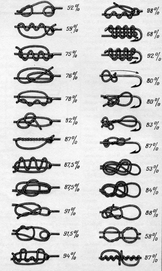 Крепость узлов в процентах Автор етой статьи опубликовал нам табличку, которую ему дали в рыболовном магазине Португалии. Ето крепость узлов в процентах Взято по материалам журнала "Рыболов" 1989
