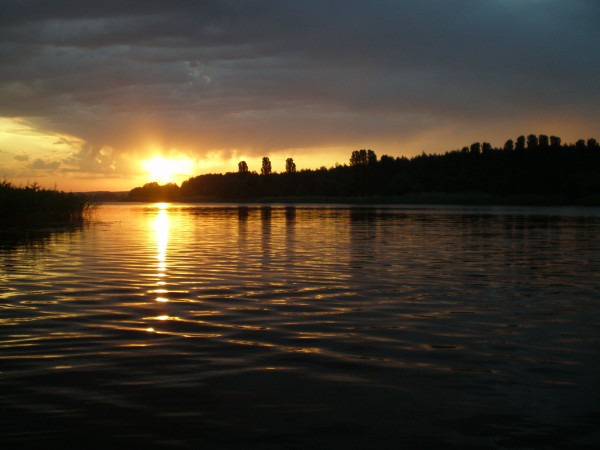 В этом году мы на водохранилище впервые и были просто поражены обилием растительности на берегах Синюхи – трава по пояс, камыш до 4-х метров в высоту. С трудом подъехав к месту где можно выйти на воду быстро собираем лодки и выходим на акваторию. Утро на Синюхе просто сказочное – восход солнца на фоне грозовых туч –зрелище фантастическое.