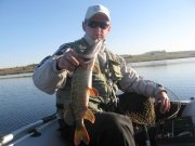 Мне же такой способ ловли не очень по душе,я люблю приноровиться к ёё настроению,понять чего ей сейчас больше хочется.Понимаю, что в таких условиях были бы очень кстати такие ребята как Дэд флоат,или Икс-кросс,но в моей коробке наиболее подходящий вариант под эту ситуацию Тини Магаллончик,вялые покачивания которого,с демонстрацией бочков и даже брюшка,почти на одном месте,способны раздразнить даже самого искушенного и ленивого хищника!Но также следовало учитывать,что преподносить его нужно было все равно в непосредственной близости от объекта охоты!В общем рыбалка довольно пассивная.Но тактика сработала,на одном из забросов,тиника в заглот взял почти килушный Щупак.Через некоторое время было решено уйти на противоположную сторону залива с несколько большей глубиной,в расчете на увеличение списка рабочих приманок и поиска более активной рыбы.Но не тут-то было!Хотя несколько выходов и было,но ничем особенным,кроме поимки пары полосатых на семидесятый ридж не закончилось!Вспомнил как в прошлый раз тут сработал страйпрошный альфа минноу,поставил и был вознаграждён поимкой двух некондиционных щупарей,реабилитированных тут же даже без фотосесии.К полудню решили шабашить,на обратном пути,из под стенки камыша взял ещё полкилушку на тот же альфа минноу.Опрос встречных экипажей лишь подчеркнул общую безклёвую картину. Ждёмс Октября.....
