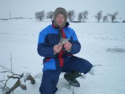 Прошлись к дамбе,потом вернулись к старым лункам и решили переехать на ставки в с.Синив...За полчаса рыбалки у Андрея на стоячку взял некрупный окунь.