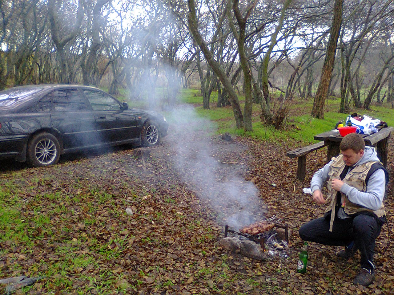 Транспорт немножко подвел по этому приехали поздно, было уже 8:00 утра. Быстро разобрались с удилищами, прикормили место и забросили снасти. Голодать нам не пришлось, с собой взяли 2 кг маринованного мяса, мешок дровишек и погнали готовить шашлык.