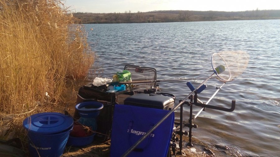 По приезду на водоем принялся к обустройству своего рабочего места. Для комфортной ловли на платформу цепляю обвес и раскладываю все необходимые принадлежности. В процессе подготовки время летит очень быстро. Желание начать ловлю быстрей просто зашкаливает.