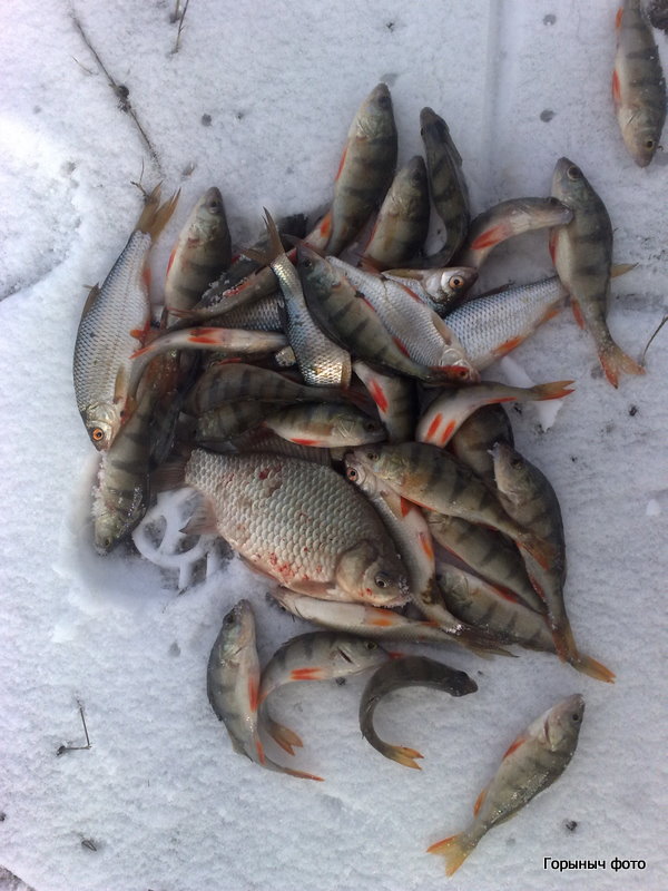 Пока Олег собирает свои поплавковые удочки, я просверлил 2 лунки и в первой же начинает клевать как из пулемета, но что странно, то 2 окуня, то 2 плоточки... Но эта очередь довольно быстро прекратилась, удалось словить только 6 окуней и 4 плотвы — ну что ж и так неплохо, иду искать рыбку на глубину ближе к средине. Сверлю с 10-ок лунок, но поймать удается по 1-2 рыбки с лунки, правда плоточка тут крупнее и если обходить лунки по 2-му кругу то опять попадается 1-2 окушка. Такая же ситуация на всем водоеме судя по тому как рыбачки ищут рыбку...