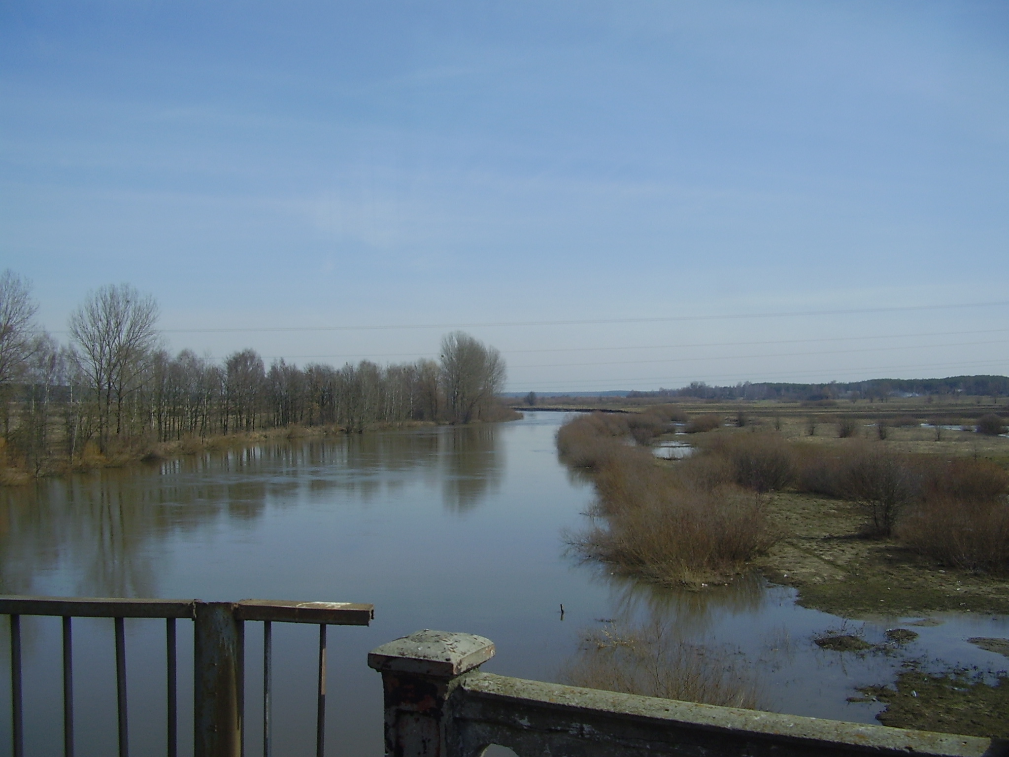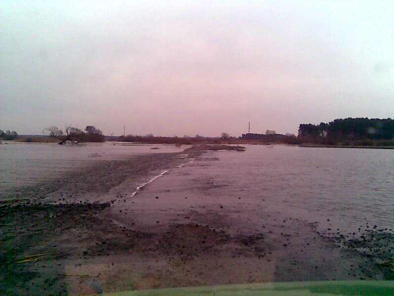Слева возле моста на Дюксын уровень воды по обрез берега — что выше обычно летнего метра на 2,5 м. Основная часть луга уже залита, через дорогу в двух местах бежит водичка — глубина на «перекатах» :) 15-20 см, но можно попасть и в яму 0,5 м! Перед мостом стоит знак :) - на фото.