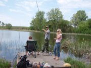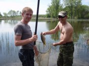 Созвонившись с арендаторами озера - решаем ехать.Приехали утром 9 мая - уехали утром 10 мая. От знака Киев по одесской трассе - 72 км до самого озера. Озера небольшие, разделенные дамбой. Берег порос камышом, много цепы под берегом. Глубина озера 1-1,5 и второго, того что выше, - до 2-ух метров. Место для рыбалки выбирали с условием, что б палатка была под боком, а таких мест - аж 2-3. Объехали озеро с противоположной стороны и разбили лагерь. Дров - валом. Предварительно поговорив с рыбаками и хозяевами, выяснили, что хороший клев был неделю назад, а на данный момент пойманы по 1-2 мелкие (до 400гр) карпики. Закармливаем фишкой зоны и фидеры в воду.... Клев был бешенный, карась с палец обгрызал все, что попадало в воду(червь мастырка, опарыш) На кукурузу - ОП. , но все таки умудрился выхватить 2 карпиковдо 0,5 кг. Оборвав 4 фидерные кормушки пришлось почистить место от камыша.