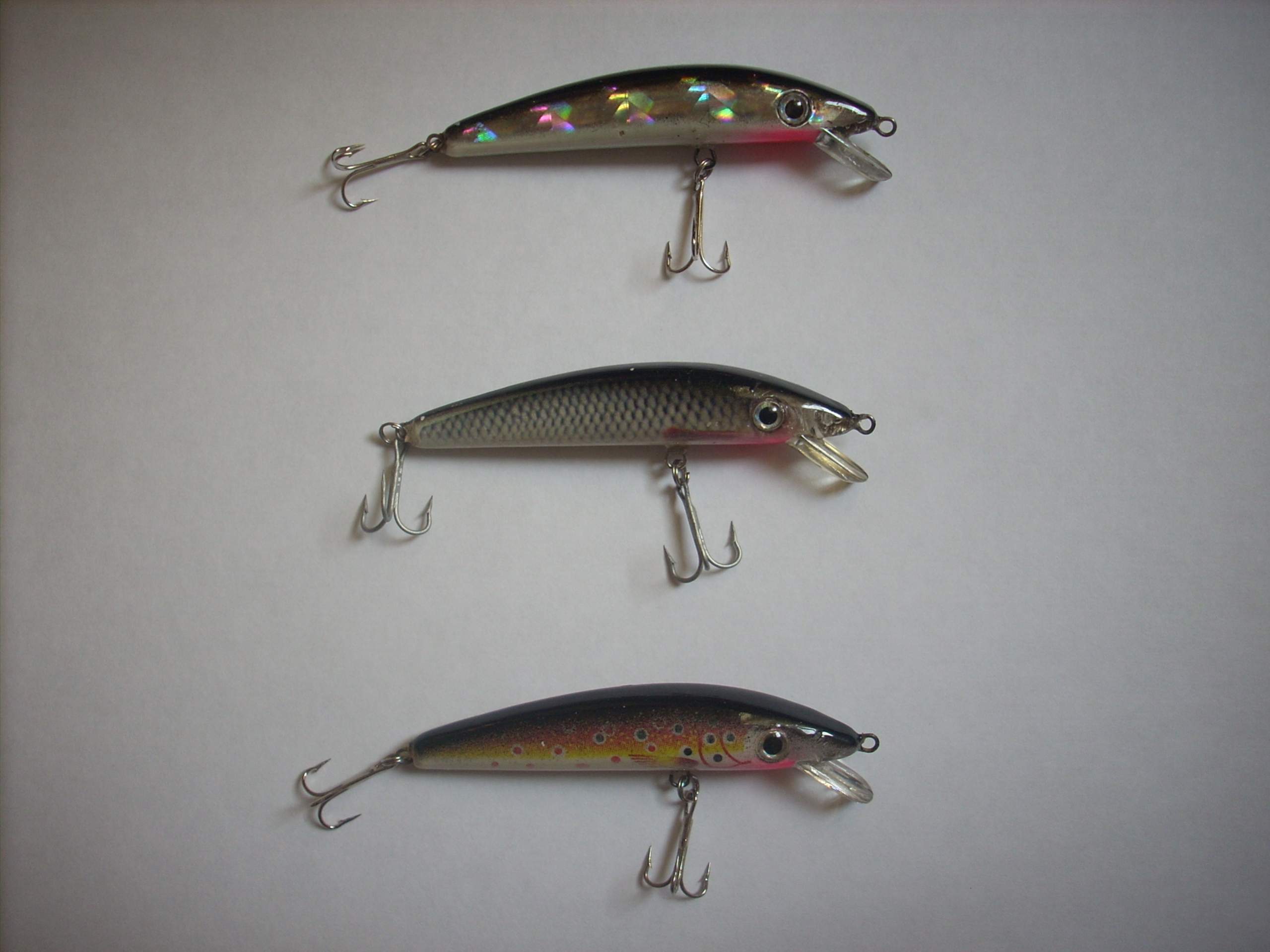 На фото №1 - воблеры типа minnow от KangXin, наверное самые дешевые на украинском рынке (цена 5-7 грн). Плавающие, 7 см, с шариками внутри, заглубление 0,3 - 0,5 м. Все рабочие, разловлены щучками до 1 кг. Знаю людей, ловивших на эти воблеры также голавля. Проводка лучше всего твичинговая. Минусы - ужасная фурнитура, заводные кольца и тройники лучше сразу заменить; петли залиты лаком (а что еще ожидать за такую цену?)