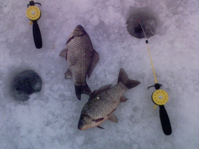 Виїхали з братом з ночі, так що на ставку були ще за темна. Дочекавшись світанку пішли вишукувати ямки (рибалка там специфічна: карась і карп стоять в невеликих ямках метр діаметром), знайшов за 10 хв. Виставив першу вудку і відразу покачування кивка, витримав паузу з 2 хв і перший впевнений підйом кивка, підсічка і карась 450г на льоду. Швидко перезаряжаю і опускаю насадку і відразу ж підйом, підсічка і ще один красень 500г на льоду. В голові промайнула думка, що сьогодні буде ВДАЛА РИБАЛКА:wo_kakaya:, але... :pЗа наступні 6 год пошуку риби жодної покльовки я та ін риболови не бачили.