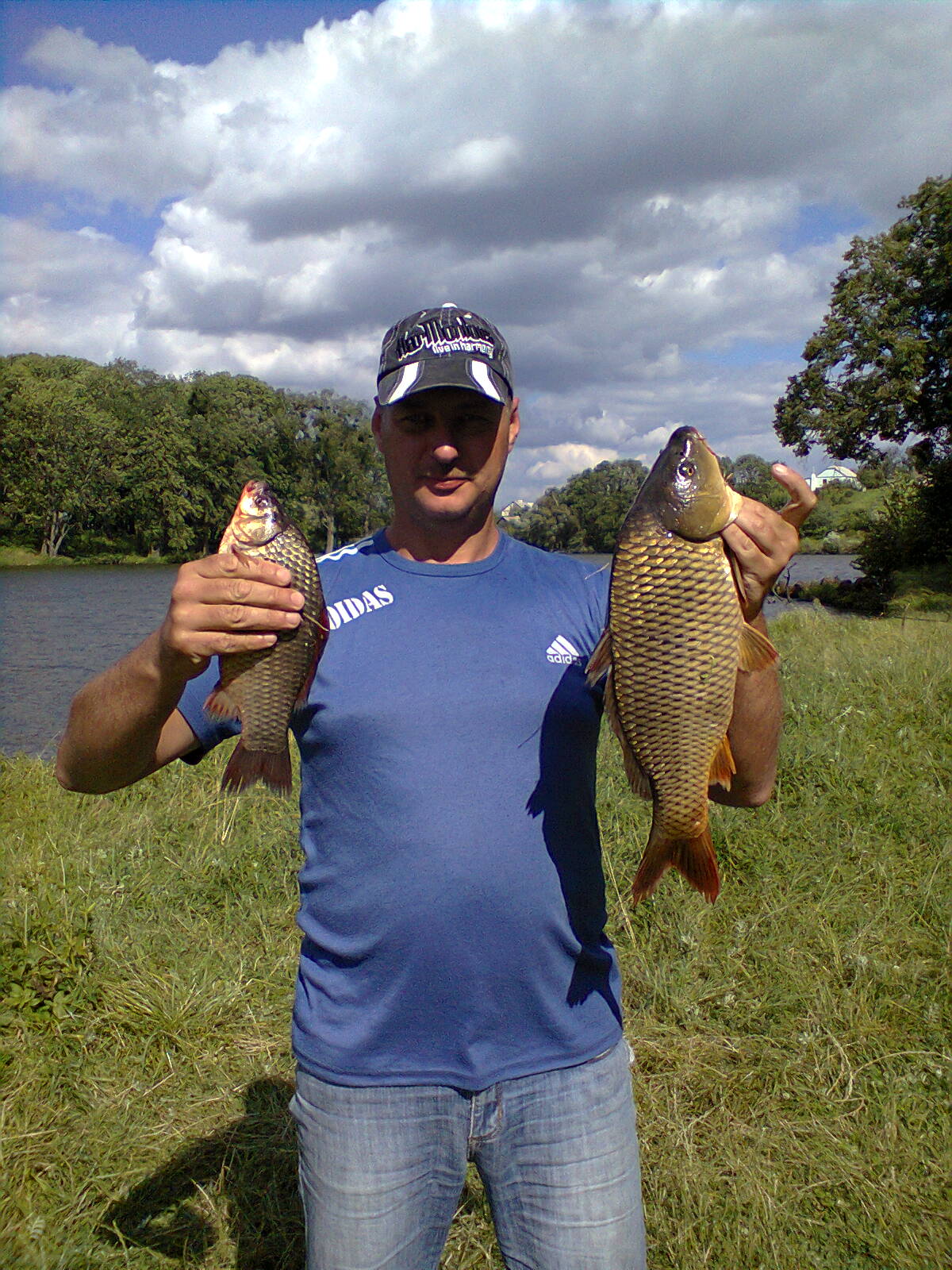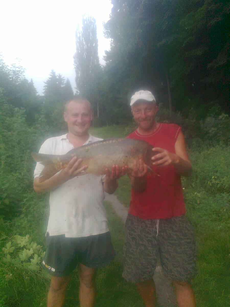 Близько трьох тижнів тому на ставку було спіймано карпа вагою 9.6 кг. Це й самий рибак біля півтора тижня тому виловив амура вагою 8 кг і два просто не зміг витягнути. Я ж був на рибі з суботи на неділю, вночі було спіймано два карасі вагою 450 гр, в годин 6 ранку ще один карась до 600 грам, через пів години ще один карась, але вже менший за попередні - 300 грам. В основному клює на замес (кожен робить свій), горох та картоплю.