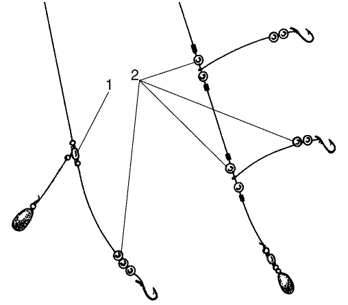 По сравнению с поплавочными донные удочки, или донки, имеют значительное преимущество: ими можно ловить при сильном ветре и высокой волне, на значительной глубине и гораздо дальше от берега. Донка не требует поплавка, который топят волны, он раскачивается из стороны в сторону и т. д. Донные снасти используют на участках с ровным дном и отсутствием водорослей, чаще на песчаном, песчано-галечном или каменистом грунте, а также на мелководных участках моря, где ловля поплавочными удочками по каким-либо причинам затруднена. Чтобы забросить донку на большое расстояние, необходимы современные двуручные удилища с мультипликаторной или безынерционной катушкой и достаточным запасом прочной лески. Донку оснащают тяжелым (до 200 г) грузом, двумя-тремя поводками и крючками № 5–16 (в зависимости от вида рыбы). В некоторых случаях эффективно применение открытых и закрытых кормушек, в которые помещают хлеб, мясо мидии, рыбную резку, рубленых морских червей, креветок и другую приманку. Грузила для морских донок имеют различную форму и конструкцию: они могут быть плоскими, ромбовидными, грунтозацепными и т. д. Для ловли на сильно каменистом дне очень удобно грузило в виде запаянной с обоих концов пластиковой трубки со свинцовой дробью. Если такое грузило попадает в расщелину между камнями, то его легче выдернуть, поскольку оно пластично. Такие грузила можно изготовить самим. Для этого потребуется пластиковая трубка диаметром 15 мм и длиной 20–30 см. Ее заполняют дробью так, чтобы последняя могла передвигаться внутри. Края трубки плотно закрывают подогнанными винными пробками. Лески закрепляют за край одного из концов трубки (рис. 345). Рис.. 345. Трубка-грузило: 1 – отверстие для крепления лески; 2 – пробки-заглушки; 3 – дробь Чтобы сделать донкой 50–80-метровый заброс, нужно обладать определенными навыками, а чтобы основная леска при этом не оборвалась, приходится применять так называемый ударный шнур, представляющий собой отрезок лески длиной 5–6 м и диаметром 0,6 мм. Его привязывают вблизи поводков и пропускают в кольца спиннинга. Однако ловить с таким шнуром не всегда удобно, поэтому зарубежные рыболовы пользуются конической леской с изначальным диаметром 0,6 мм и через каждые 9–10 м ее диаметр уменьшается до 0,37; 0,33; 0,3 или 0,28 мм. Кроме того, каждый конический участок окрашен в свой цвет, что позволяет рыболову определить дальность заброса снасти, а при поклевке установить расстояние от берега до местонахождения косяка рыбы. Нередко используют грубые донные снасти с различным расположением поводков, которые забрасывают с руки или с помощью подручных приспособлений, например, шнур или леску наматывают на консервную банку со вставленной внутрь палкой, выполняющей роль ручки – ее рыболов держит при забросе. Сначала леску прижимают пальцем к банке, затем оснастку раскручивают и посылают в море, леска при этом свободно сходит с банки. Таким образом можно забросить снасть на 50–60 м вдаль. При ловле донными снастями на заиленном или каменистом дне часто требуется приподнять насадку над грунтом. Для этого используют специальные пенопластовые поплавочки, окрашенные в зеленый или коричневый цвета, в них монтируют длинноцевьевые крючки. Такие поплавочки крепят и посередине поводка. Добавлено через 1 минуту Донка с подвижной насадкой Известно, что движущуюся 