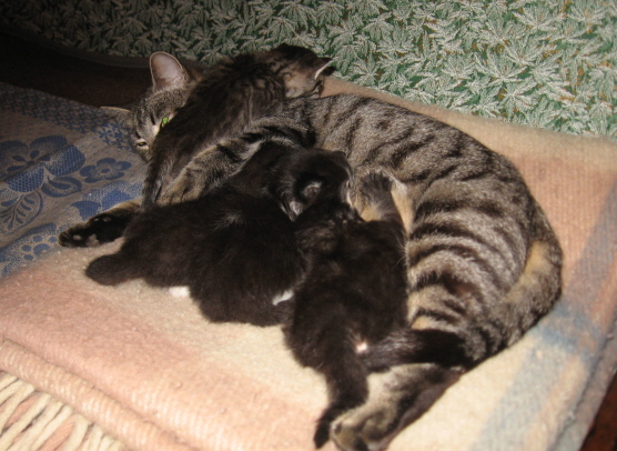 Наши домашние животные кошка Нюрка и её сынок кот Боцман. Коту 8 месяцев. Скоро у кошки будут котята. Относятся к лесным котам.