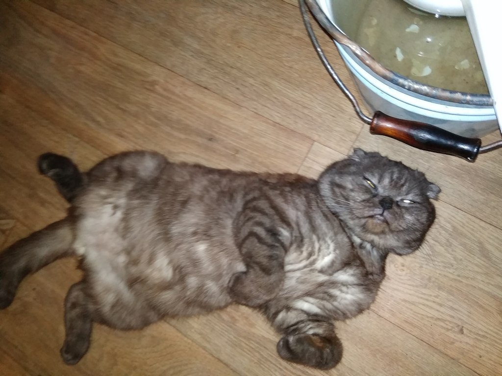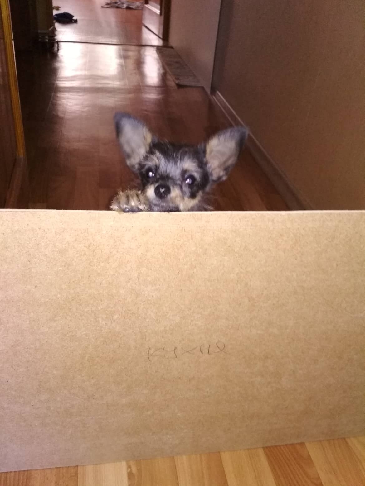 Идёт процесс привыкания к туалету в определённом месте. Пришлось купить лист ДВП и закрыть проёмы дверей, оставив зону для щенка. Ещё он норовит всё взять в рот, ну и зубки крошат всё подряд. На фото - мы не можем попасть на кухню, зато всё видим, что происходит.
