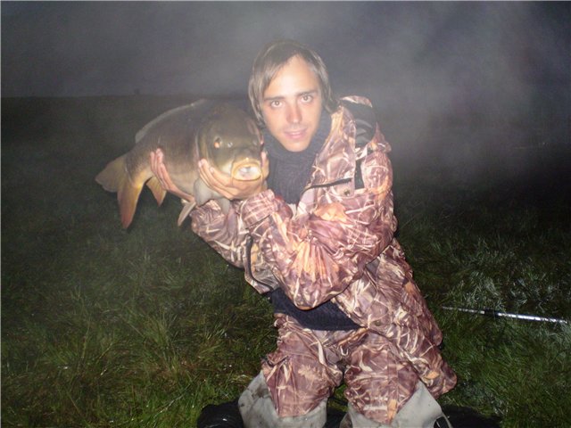 Маркування показувало або зацепи або траву або 1,6м. Причому 1,6м. були між травою, камишем та ще якоюсь рослинністю на 40-50 від берега. Перекидувати ту рослинність, сенсу не було. Все вирішено та закинуто + закормлено. Віталій скептично віднісся до ретельного закорму місця ловлі з допомогою "апельсинів", але на основі прикормки "Карп-Сазан" у воду полетіла кукурудза, бойли, пєлетс та ще купа різних домішок. В свою чергу я скептично віднісся до "Карп-Сазан", оскільки маю деякі думки, щодо позитивнішого використання "Карп-Карась" в даних умовах. Але...закормилися і почалися цікаві історії та купа кави з чайом. Ніч принесла купу сирості та холоду і ми вирішили передрімнути. В мене як завжди заведений будильник на 1,5 год. вперед і тепленька "разкрівушка" допомагає задрімати. Але вже о 02:47 мене будить шалений крик сигналізатора. Вилітаю з палатки та беру до рук палку і відразу відчуваю, що супротивник не здасться без бою. Фрикцион вищить, Віталій похрапує, а палка гнеться. Вирішую набрати товариша на мобільний - за декілька секунд Віталій вже з підсаком поруч. Але не так все просто...через 15хв. я реально втомлююсь і передаю палку напарнику. За 10 хв. знову палка в мене в руках і в мене в голові виникає думка, що цього супротивника МИ будемо тягати до ранку. Але, нажаль, риб зачепив сусідню палку ти вибив крючок в себе з роту. Це СТАЛОСЯ о 03:55. Я був в ШОЦІ. Отакої, жилку змінив, лідкори поставив міцні, повідок теж свіженький та дуже міцний і...прикрий схід після майже ГОДИННОЇ боротьби. Але менше з тим, риболовля триває.