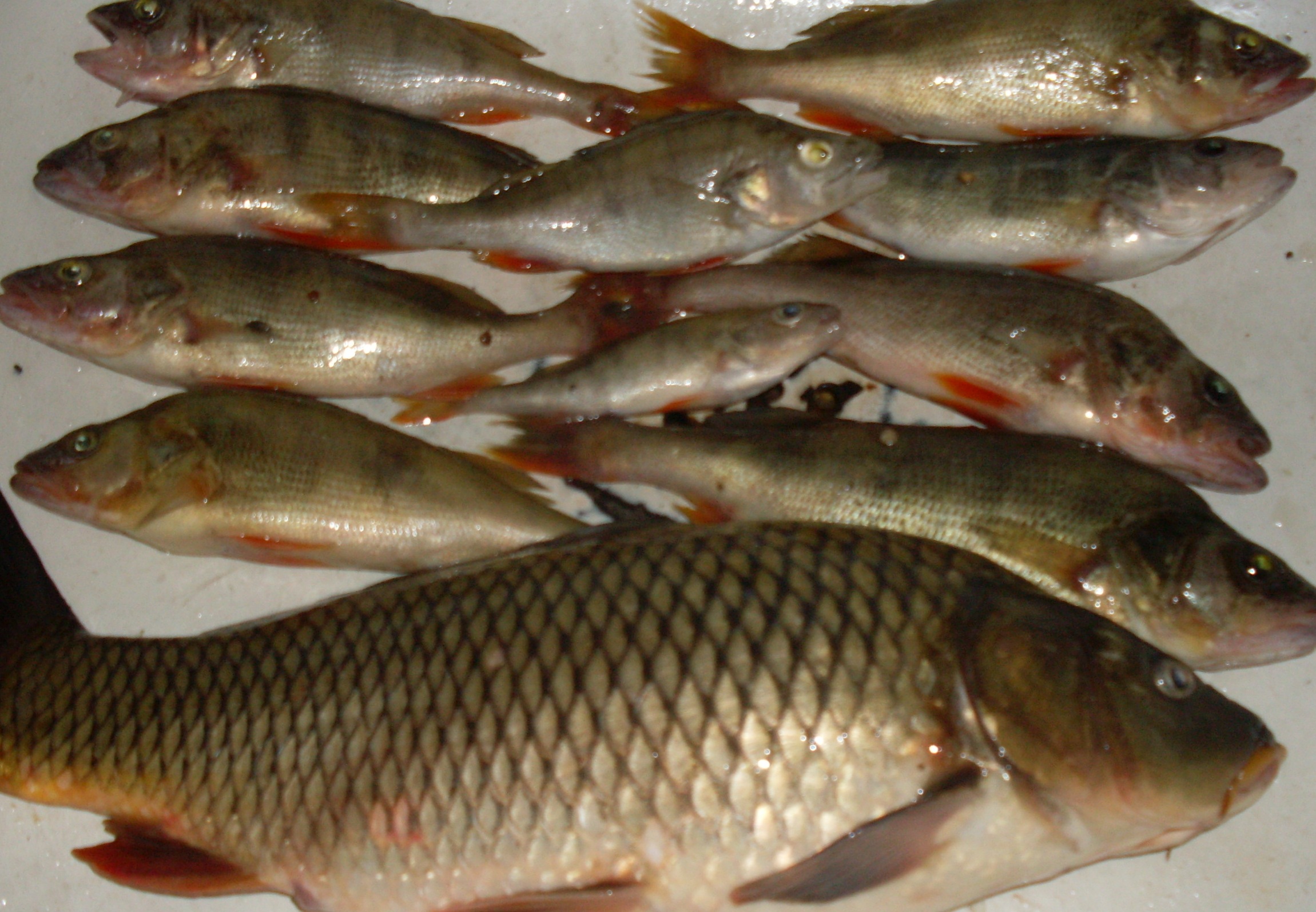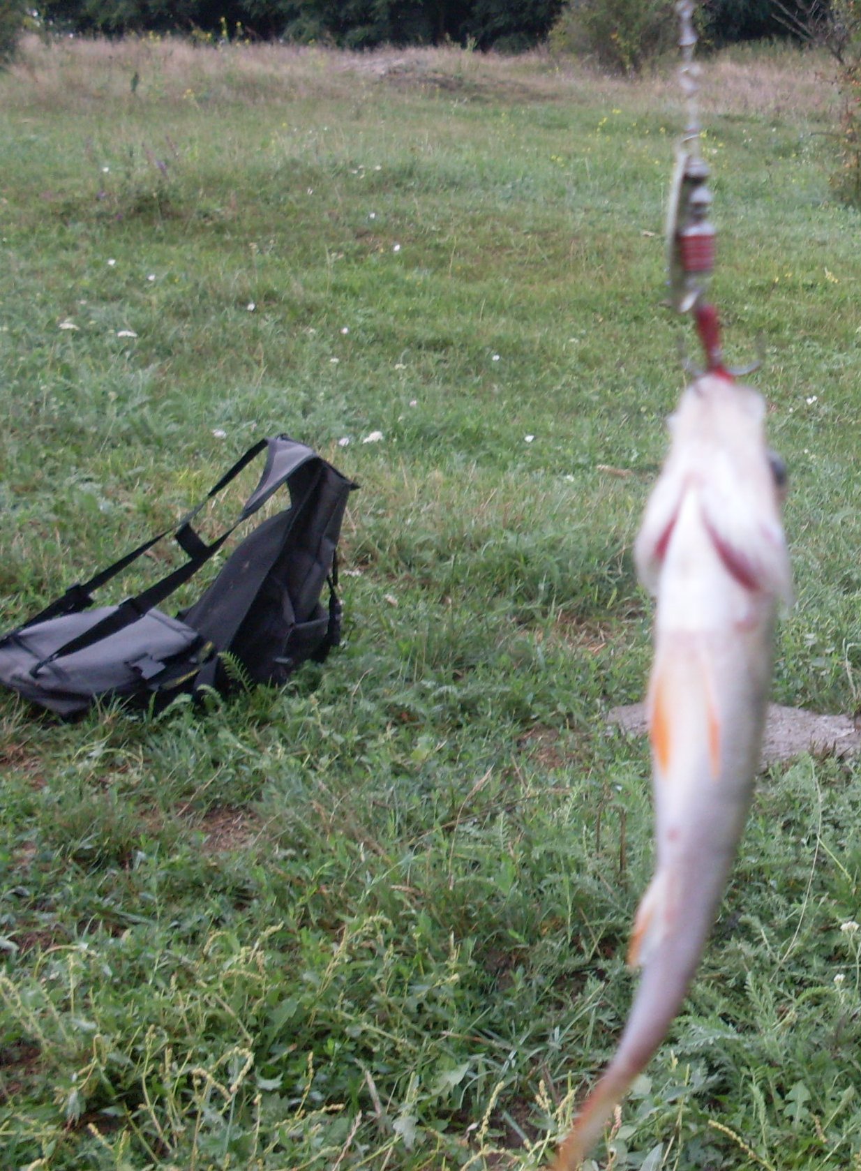 Опять с брательником с субботы по понедельник выехали на данный водоем. Брат ловил на поплавчанки и на дальники. Я со старта закинул 4 карповика с горохом, кукурузой и бойлами. а дальше взял спининг и пошел гонять окуня. В субботу вечером уговорил пяток на съедобку.Карповики упорно промолчали. В воскресенье погода испортилась и клев тоже, Наварили ушицы и дальше в бой.У брательника карась и карпики грамм по 300, которые топились, и как всегда краснопер.Дальники закидывал метров на 10-15, если дальше то клева нет напрочь.В понедельник с утра пошел опять на свидание с окунем,на вертушку позарился карп,еле выволок на берег, палочка то УЛ и шнурок 0,1 который уже на берегу лопнул. Вообщем отдых вышел на славу, вот токо с погодой ну не прет мне, что не вылазка обязательно дождь.
