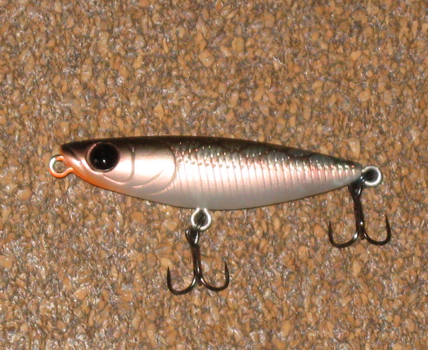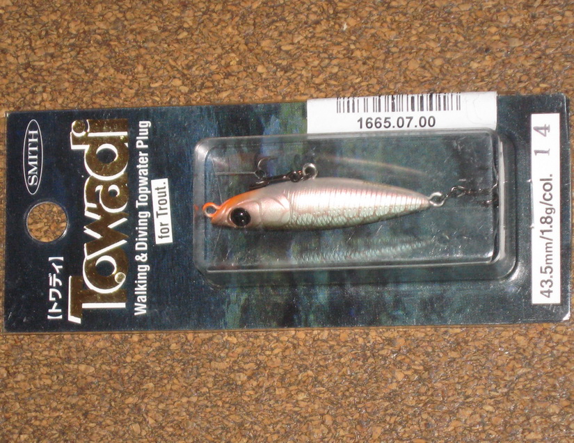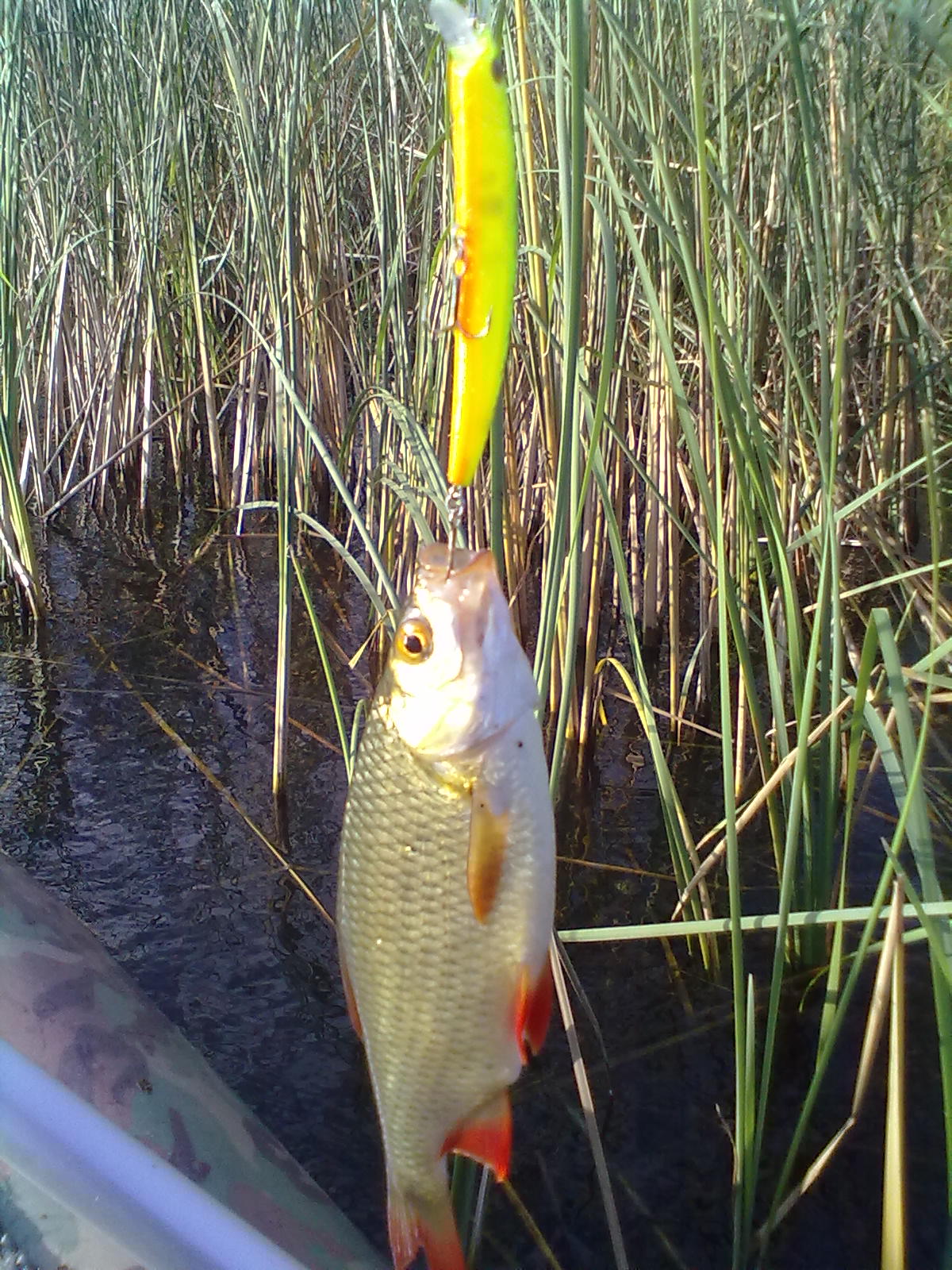 Сегодня хотелось бы сказать пару слов о мини волкере от SMTH- предсталяю- Smith Towadi в цвете(14),размер 4.3см и вес малыша 1.8 г.Это волкерок попал ко мне с месяц тому назад,естественно я его пытался пару раз разловить и вообще приспособится к нему и не получалось ни как.Почему,ответ я нашел сегодня.Этот малыш любит все деликатное и самая лучшая его игра происходит вообще без дополнительной фурнитуры(вертлюжок,застежка),а на простой петле Рапала.Шнур или леска дело вкуса,но оба компонента самые тонкие(шнур 4-6LB,леска 0.16-0.18мм).Я ловил на монолеску 0.18мм.В воде волкер принимает вертикальное положение(торчит кончик носа,под углом 60).Лучше осваивать его на не большом течении и малой глубине),цвет желательно поярче,что бы (хорошо корректировать проводку).Спиннинг желательно иметь с достаточно жесткой вершинкой,и длинной не более 2.0м,мой 2.28м чуть длинноват под него,а вот 2.13м был бы в самый раз.Ловил я на спиннинг Шимано Диафлеш LS до 7гр,в росте 2.28м..Заброс его довольно не плохой,я бросал на 10-15м,гораздо важнее точность броска.Кувшинка практически доходила до поверхности,кое где есть глубинные окна по 20-30см,при общей глубине реки около 60-70см.Пока я пробирался по этим зарослям рыба и довольно крупная уходила в эти лопухи на меляк,а вот провести там другие приманки кроме Smith Towadi и еще мух))),было проблематично.Амплитуда колебаний кончика спиннинга не большая около 10см,может чуть больше,гораздо больше играет роль скорость подмотки и непрерывный ритм.Причем было пару поклевок прямо на падении волкера,отмечу из за малого веса при падении он скорее привлекает рыбу.Темп быстрый и при таком темпе змейка идет очень быстрая,и выходы происходят постоянно(останавливаешь волкер рыба теряет к нему интерес),но помогает течение,хоть оно небольшое,но рыба атакует приманку снова и снова.С не привычке довольно быстро устает кисть и приходится пару сек менять руку,но потом привыкаешь.Очень помогает визуальный контроль приманки,наверное это самое главное в ловли этим малышом.Окунь брал его хорошо,но % реализации поклевок низкий.Белая крупная рыба(похоже даже карась пару раз пытался его хапнуть).Ловить им очень зрелищно и интересно,но не слишком добычливо.Хотелось бы попробовать ловить им в зеленом цвете и в другом месте.