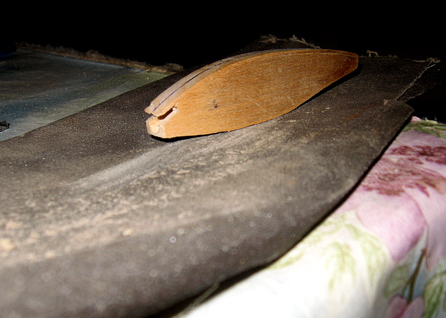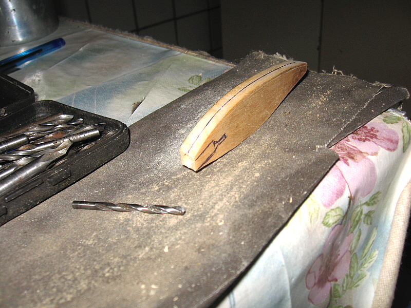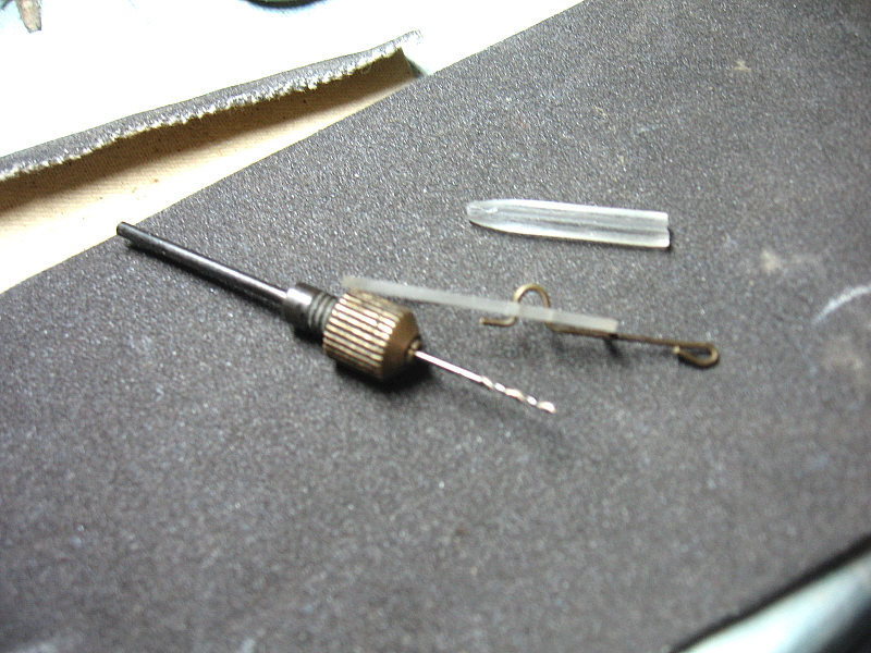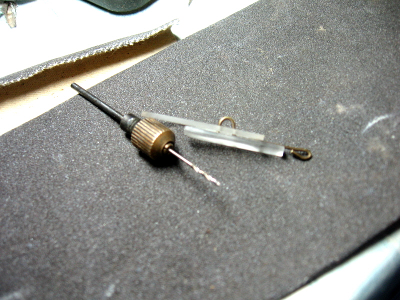 Киль лопатки также из орг. стекла, толщиной 3мм ширина 5мм. Вдоль киля по ширине делаем пропил глубиной 1,2мм ширина 1мм (толщина ножовочного полотна по металу). С обр. стороны закругляем и получаем пол диаметра отверстия.