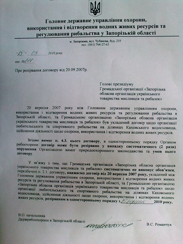 Ассоциация рыболовов Украины обращается к Рыболовам Запорожья