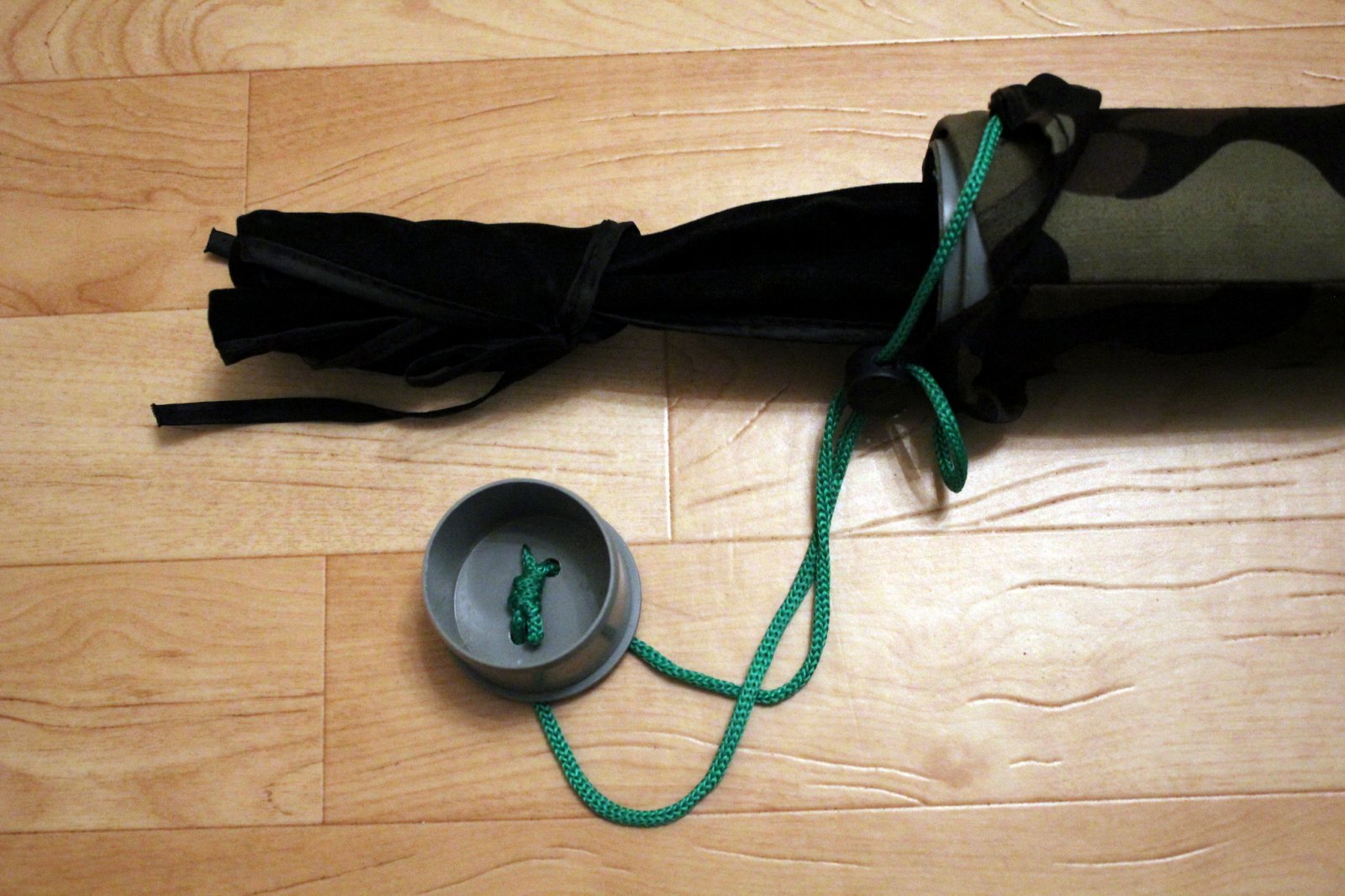 две заглушки, муфта, труба длиной 1 метр, 30х150 см ткани, 1 метр ремешка и 1 шнурок зеленого цвета)))