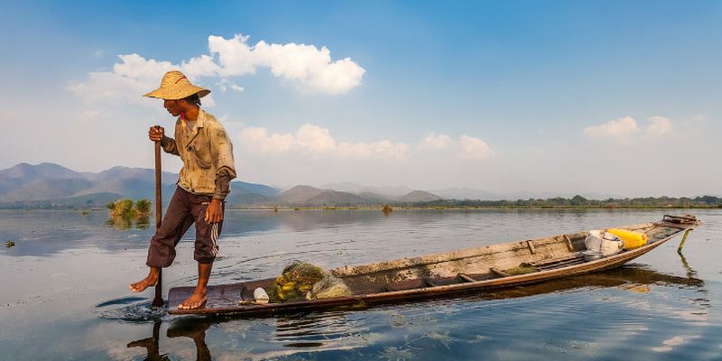 Самое поразительное на озере Инле - это необычный способ гребли, практикуемый местными жителями. Инта не гребут сидя, они стоят на носу лодки обвив ногой весло, орудуют им с удивительной ловкостью и изяществом. Такой способ удобен тем, что одна рука всегда остается свободной и ей можно на ходу управляться с рыбацкими снастями.