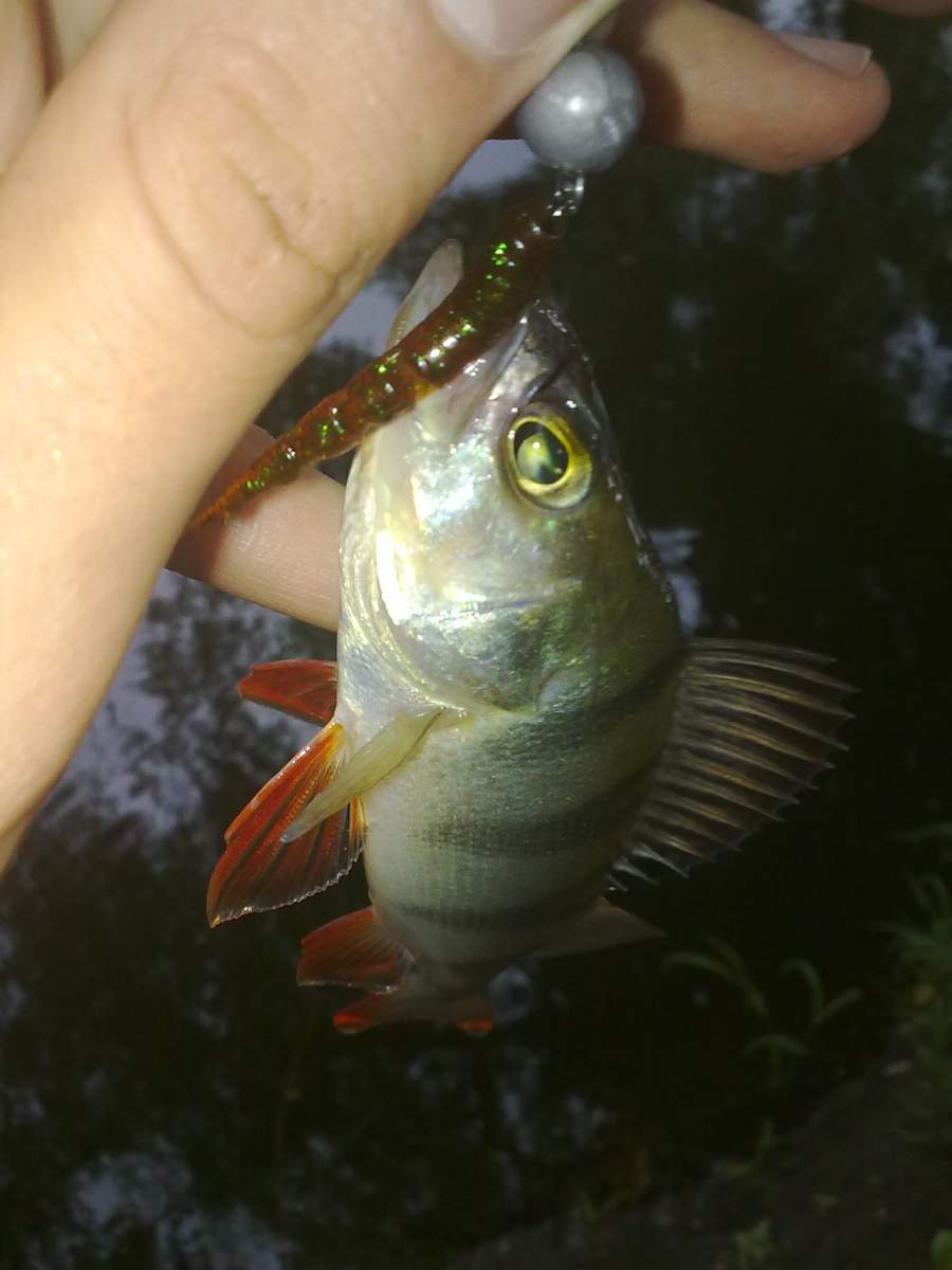 Идя по пути домой а тоесть в сторону остановки, пробую место где до этого гулял окунь, но не хотел брать на выше сказаные приманки (воблера), пару проводок и вот очередная приятность :);)